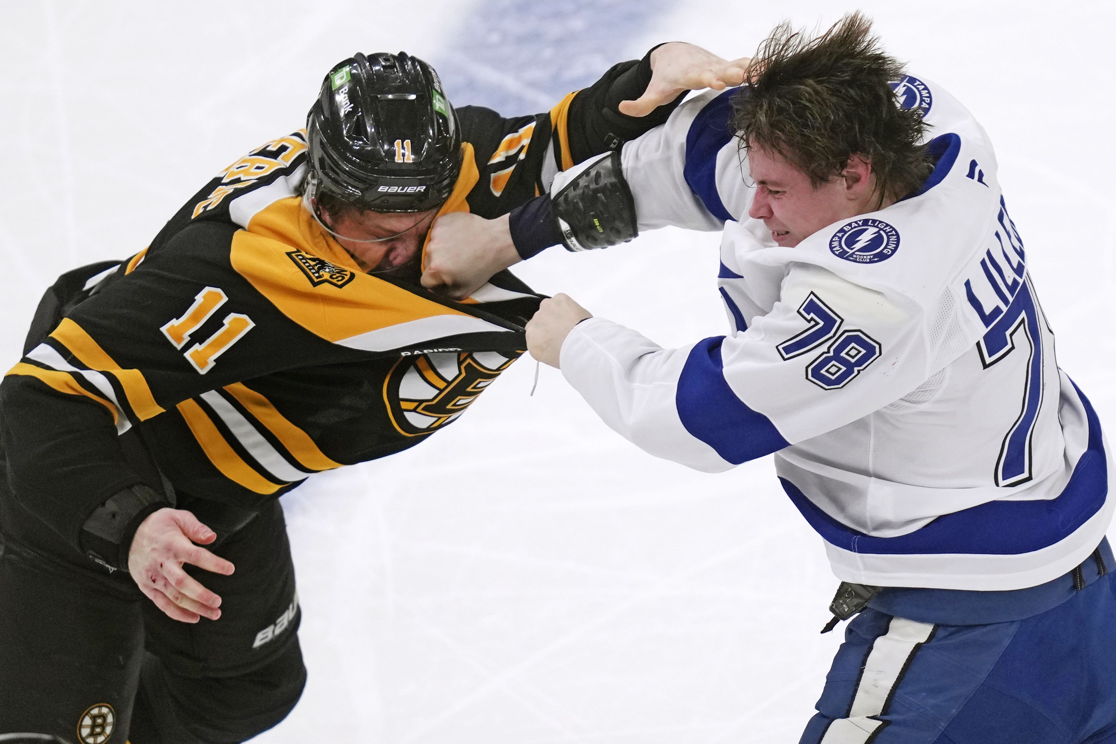 Tampa Bay Lightning defenseman Emil Lilleberg (78) lands a punch during his fight with Boston Bruins center Trent Frederic (11) during the second period of an NHL hockey game, Tuesday, January 14, 2025, in Boston. (Photo by Charles Krupa/AP Photo)