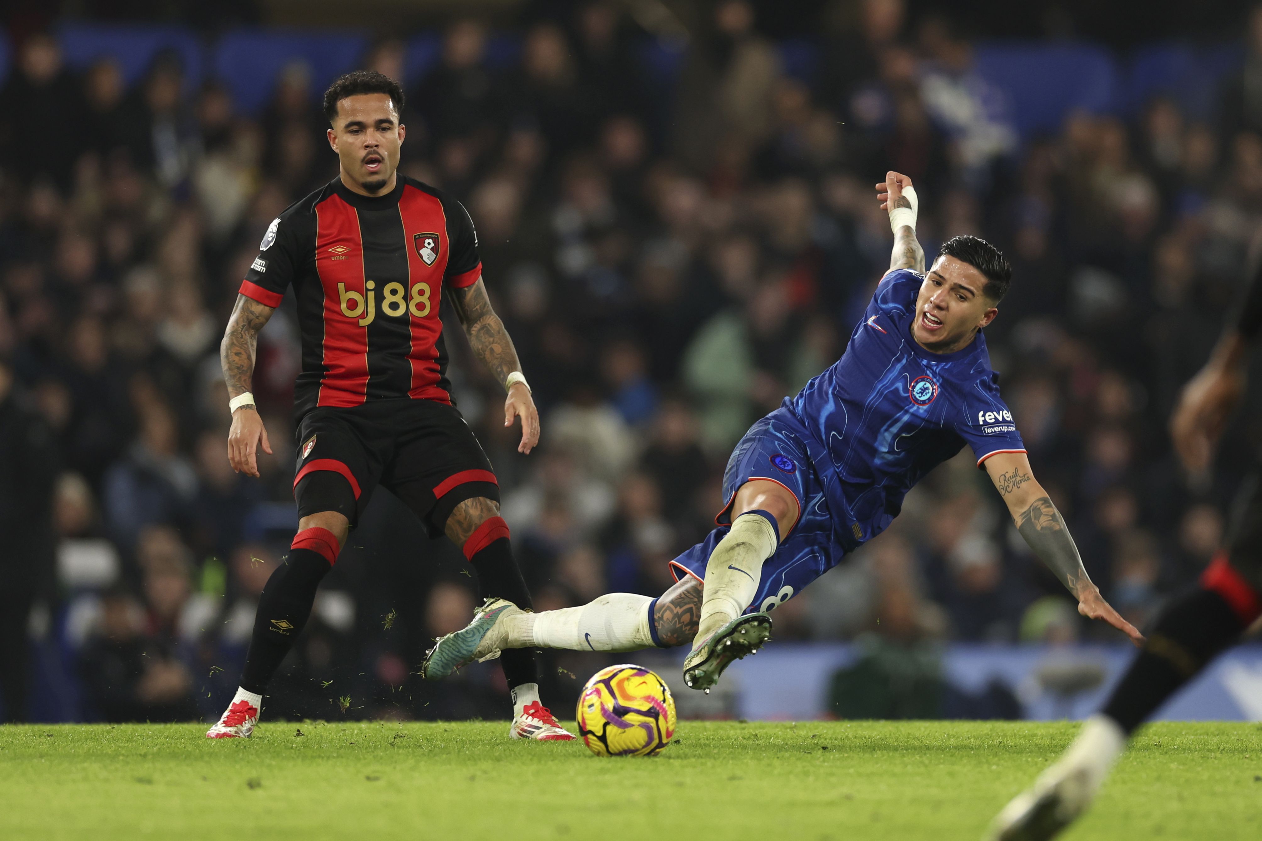 Chelsea's Enzo Fernandez, right, challenges for the ball with Bournemouth's Justin Kluivert during the English Premier League soccer match between Chelsea and AFC Bournemouth at Stamford Bridge stadium, in London, Tuesday, January 14, 2025. (Photo by Ian Walton/AP Photo)