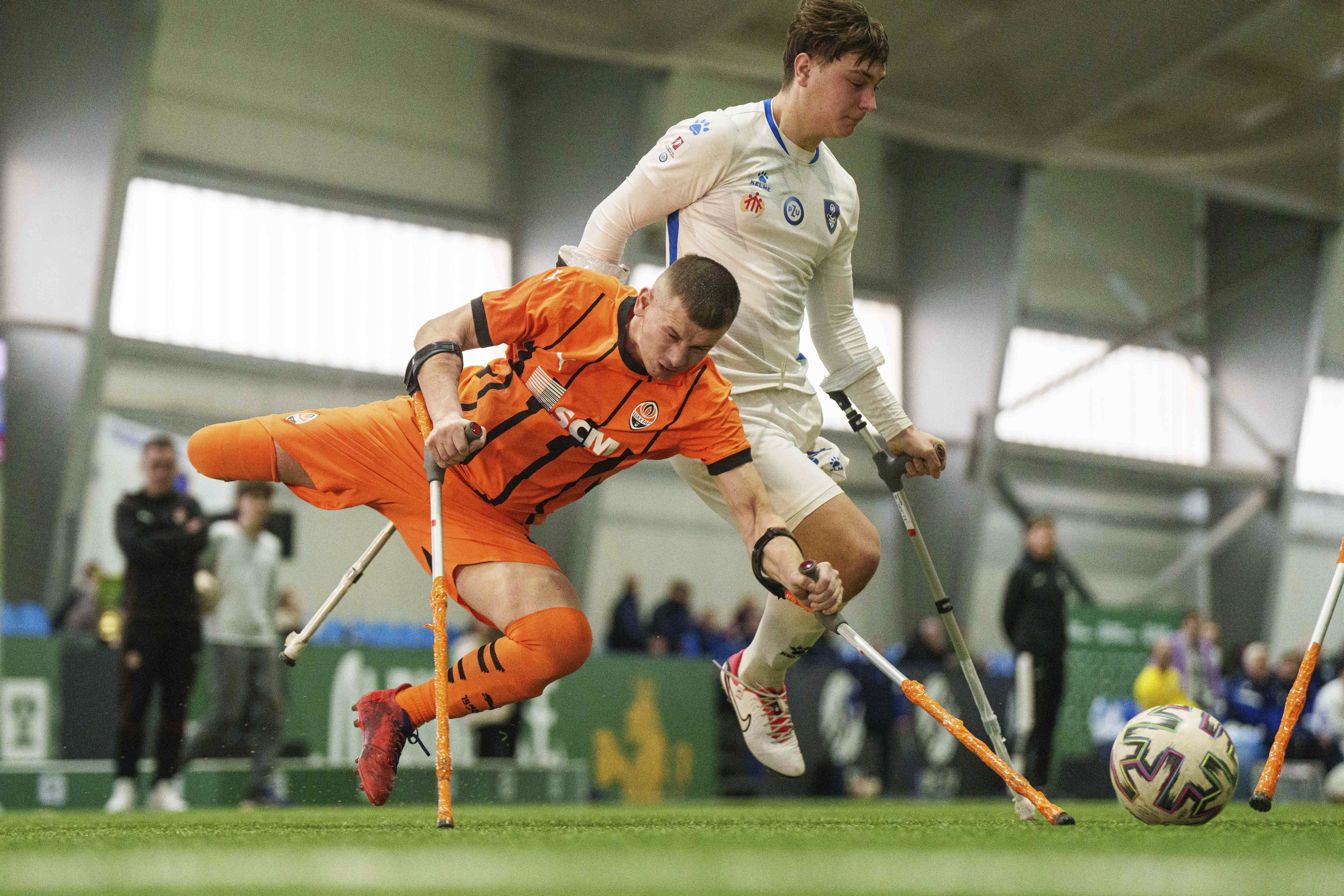 Soccer players of Shakhtar Stalevi and Pokrova FC-2 play during the first football tournament for war-wounded amputees in Kyiv, Ukraine, January 12, 2024. (Photo by Evgeniy Maloletka/AP Photo)