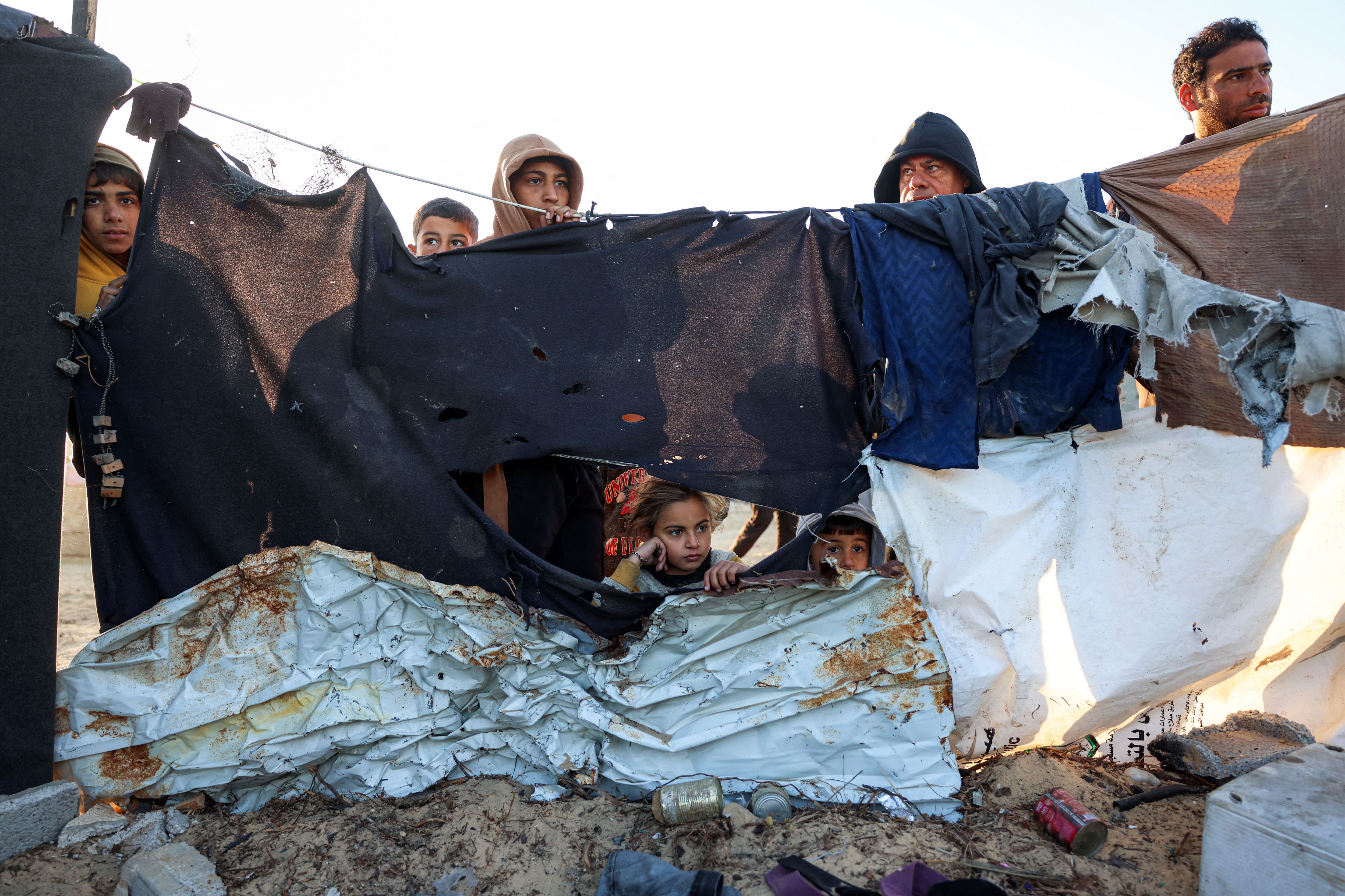 Men and children watch as people inspect the site of reported Israeli bombardment on tents sheltering Palestinians displaced from Beit Lahia at a camp in Khan Yunis in the southern Gaza Strip on December 25, 2024 amid the ongoing war in the Palestinian territory between Israel and Hamas. (Photo by Bashar Taleb/AFP Photo)