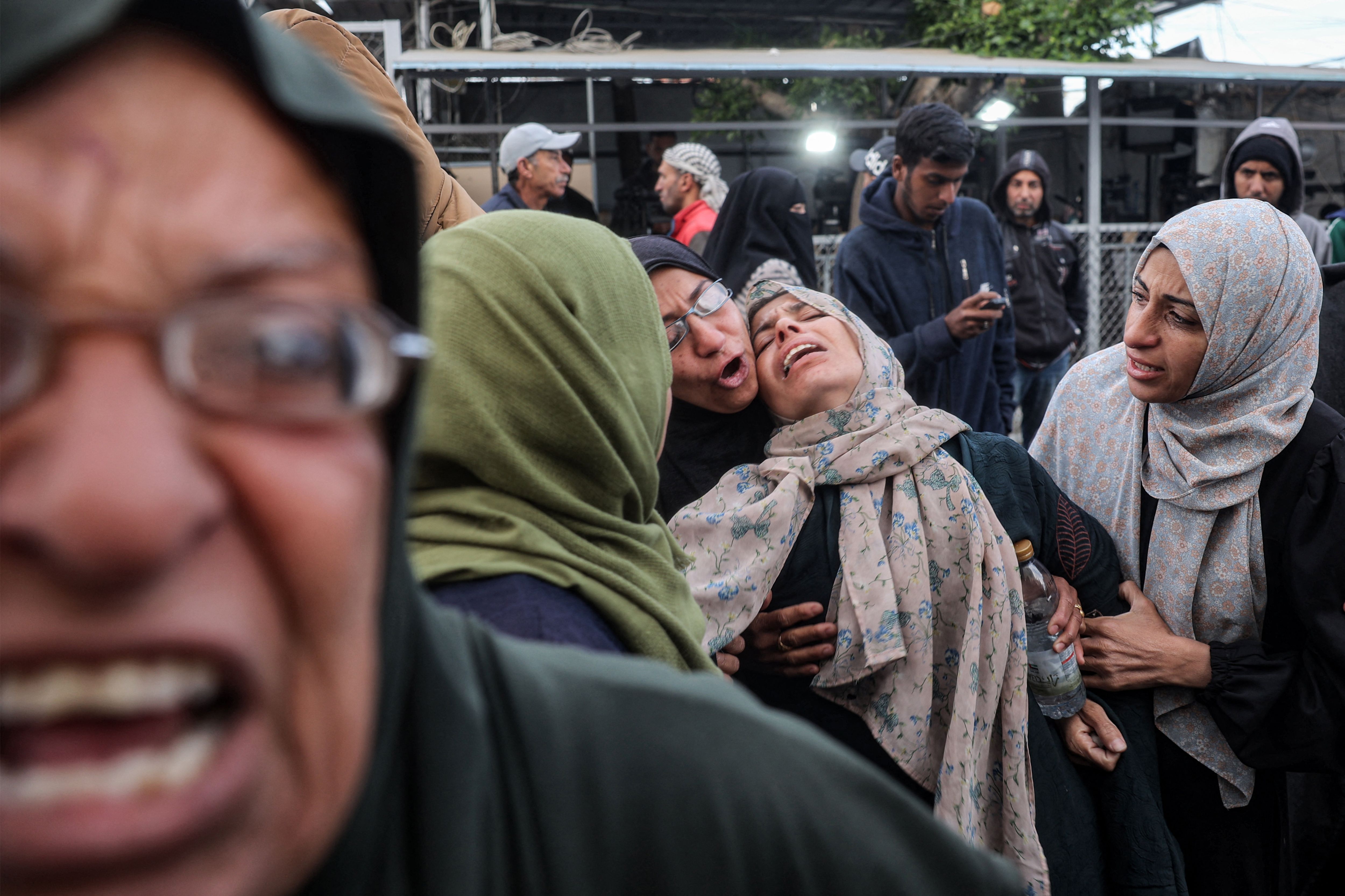 Women mourn their relatives who were killed by Israeli bombardment outside the Aqsa Martyrs hospital in Deir el-Balah in the central Gaza Strip on January 5, 2025 amid the ongoing war in the Palestinian territory between Israel and Hamas. (Photo by Eyad Baba/AFP Photo)
