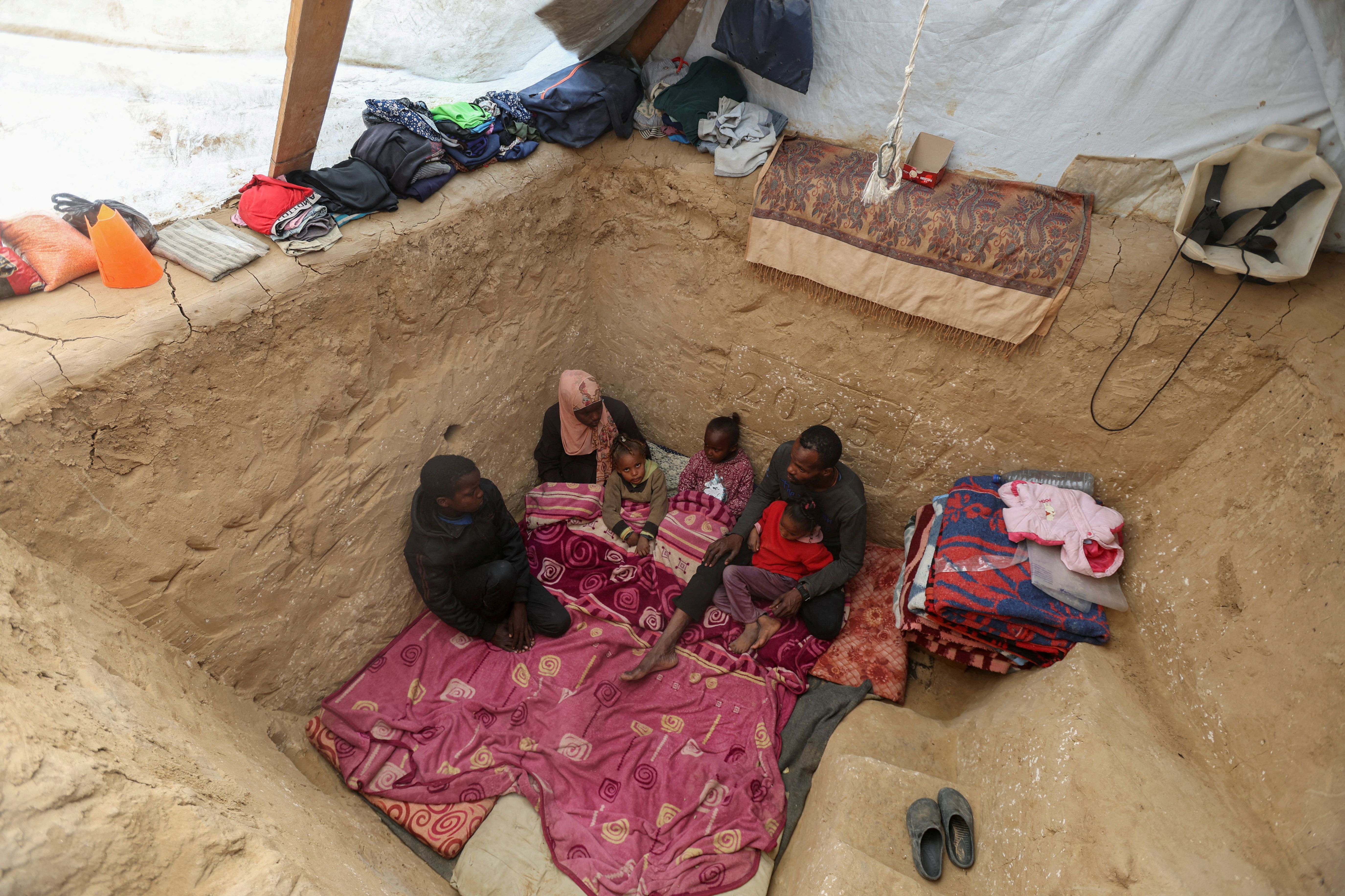Displaced Palestinian man Tayseer Obaid sits with his family in an underground pit he dug at their tent encampment to protect them from Israeli strikes, in Deir Al-Balah, central Gaza Strip, on January 6, 2025. (Photo by Ramadan Abed/Reuters)