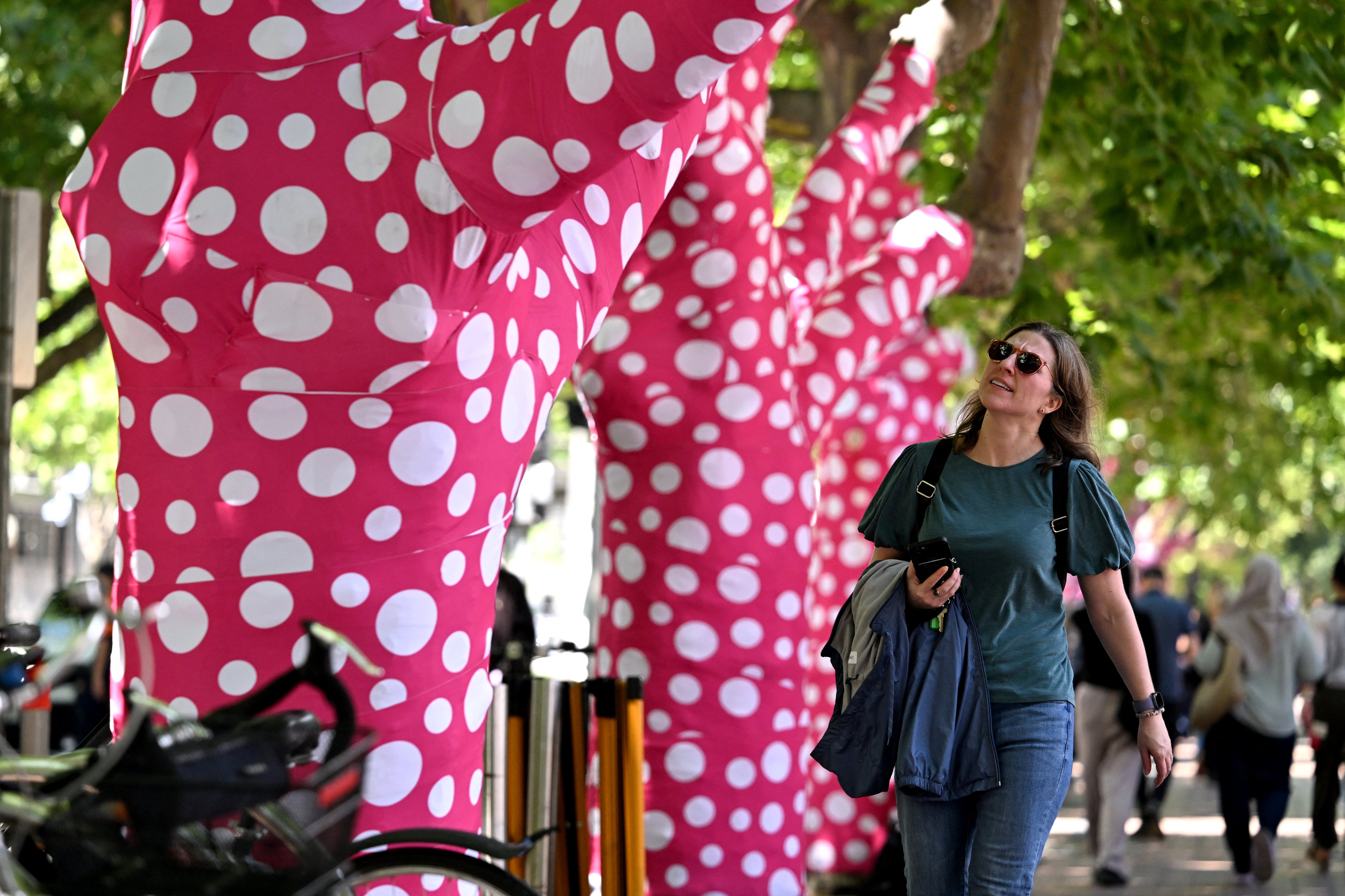 A woman looks at some of the 60 plane trees wrapped in a pink-and-white polka-dot design developed especially for Melbourne by Japanese contemporary artist Yayoi Kusama titled “Ascension of Polka Dots on the Trees”, in Melbourne on November 27, 2024. The National Gallery of Victoria’s (NGV) world-premiere blockbuster exhibition Yayoi Kusama will be on display from 15 December 2024 to 21 April 2025. (Photo by William West/AFP Photo)