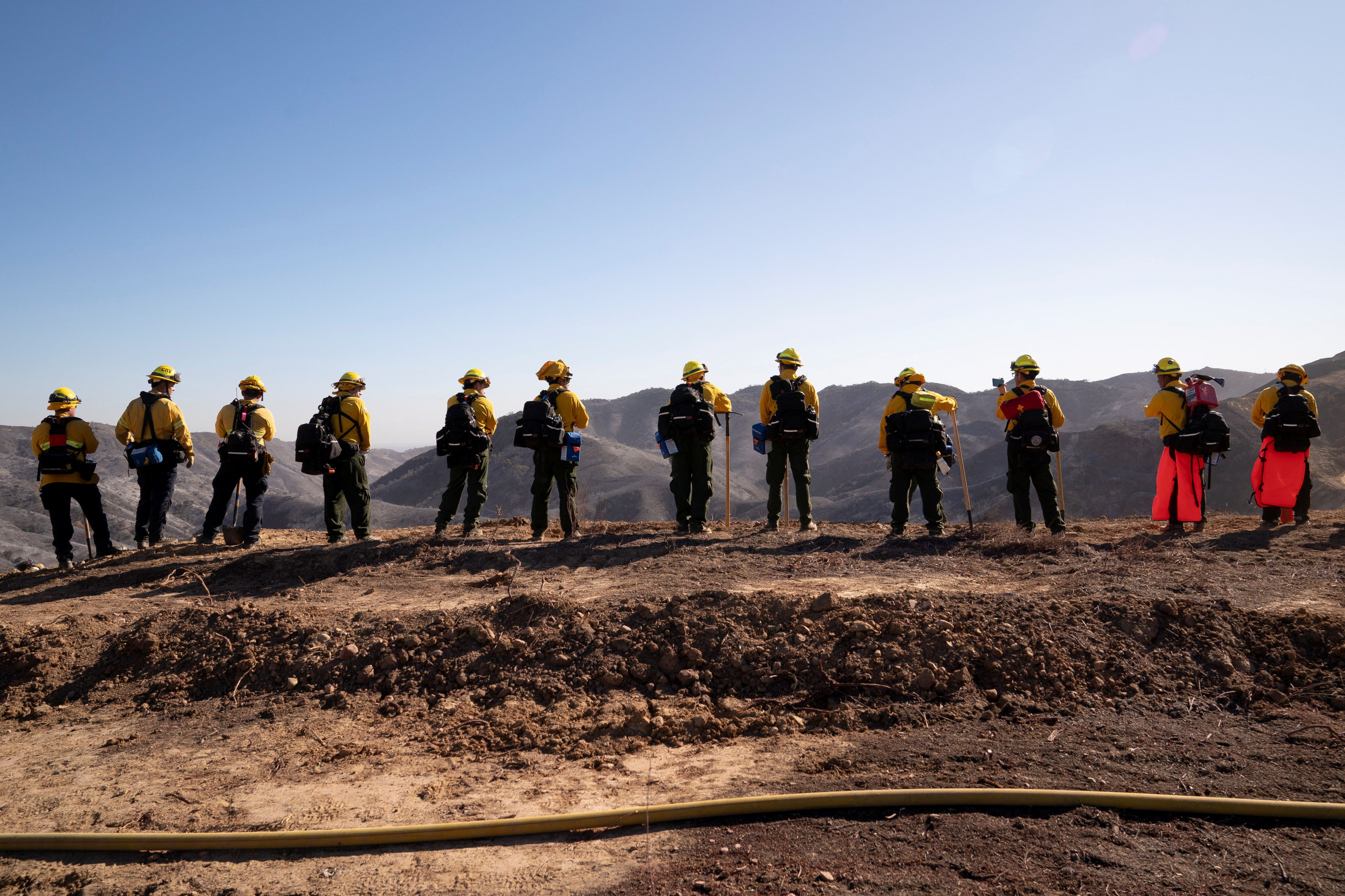 Firefighters from Mexico rest while hiking to their destination to cut a containment line in the Tarzana area during the Palisades Fire in Los Angeles, California, U.S. January 13, 2025. (Photo by David Ryder/Reuters)