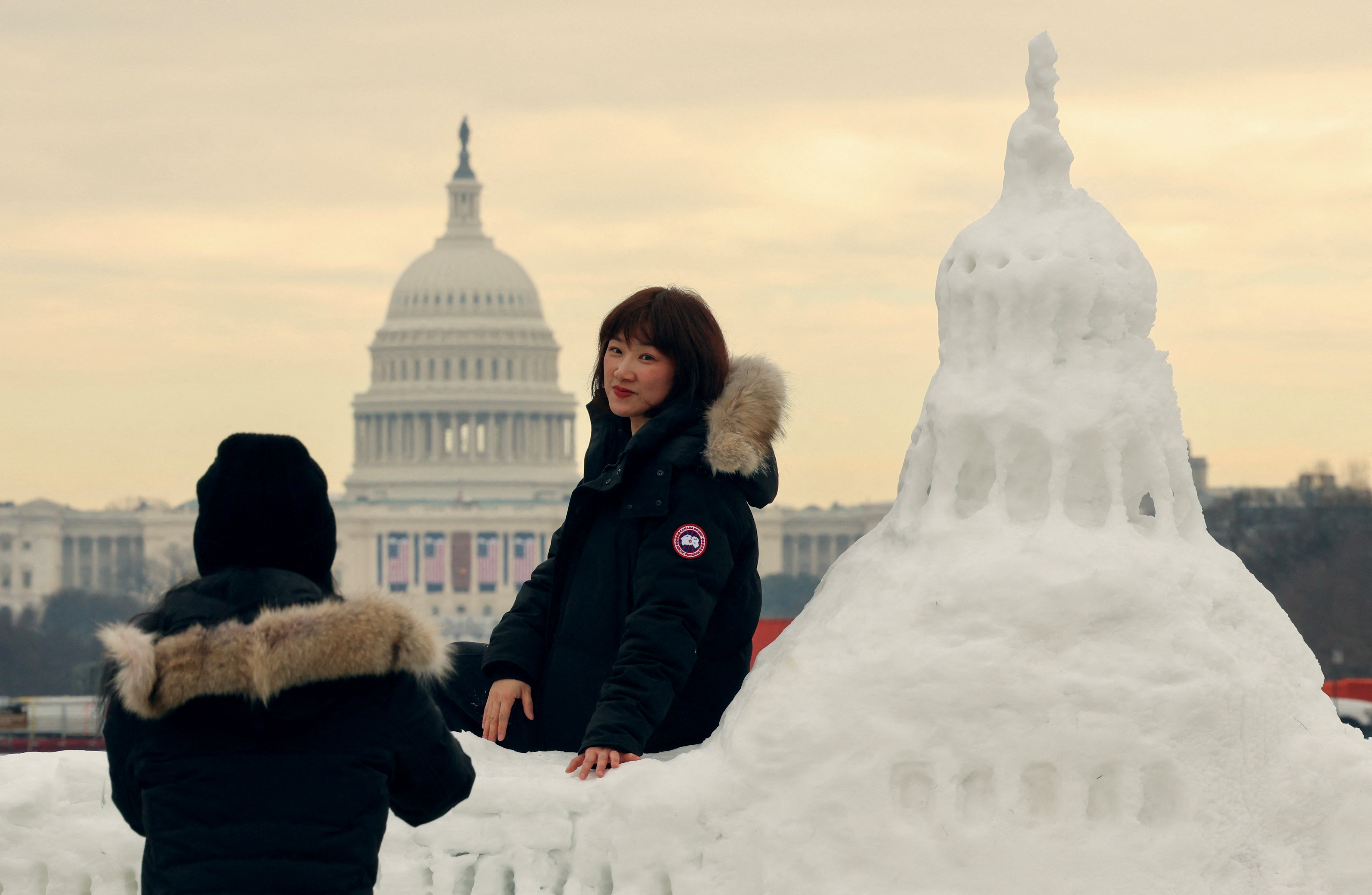 Tourists from China pose for photos with a snow sculpture of the U.S. Capitol with the actual Capitol in the background, decorated with flags for the upcoming inauguration of U.S. President-elect Donald Trump, on the National Mall in Washington, U.S., January 13, 2025. (Photo by Kevin Lamarque/Reuters)