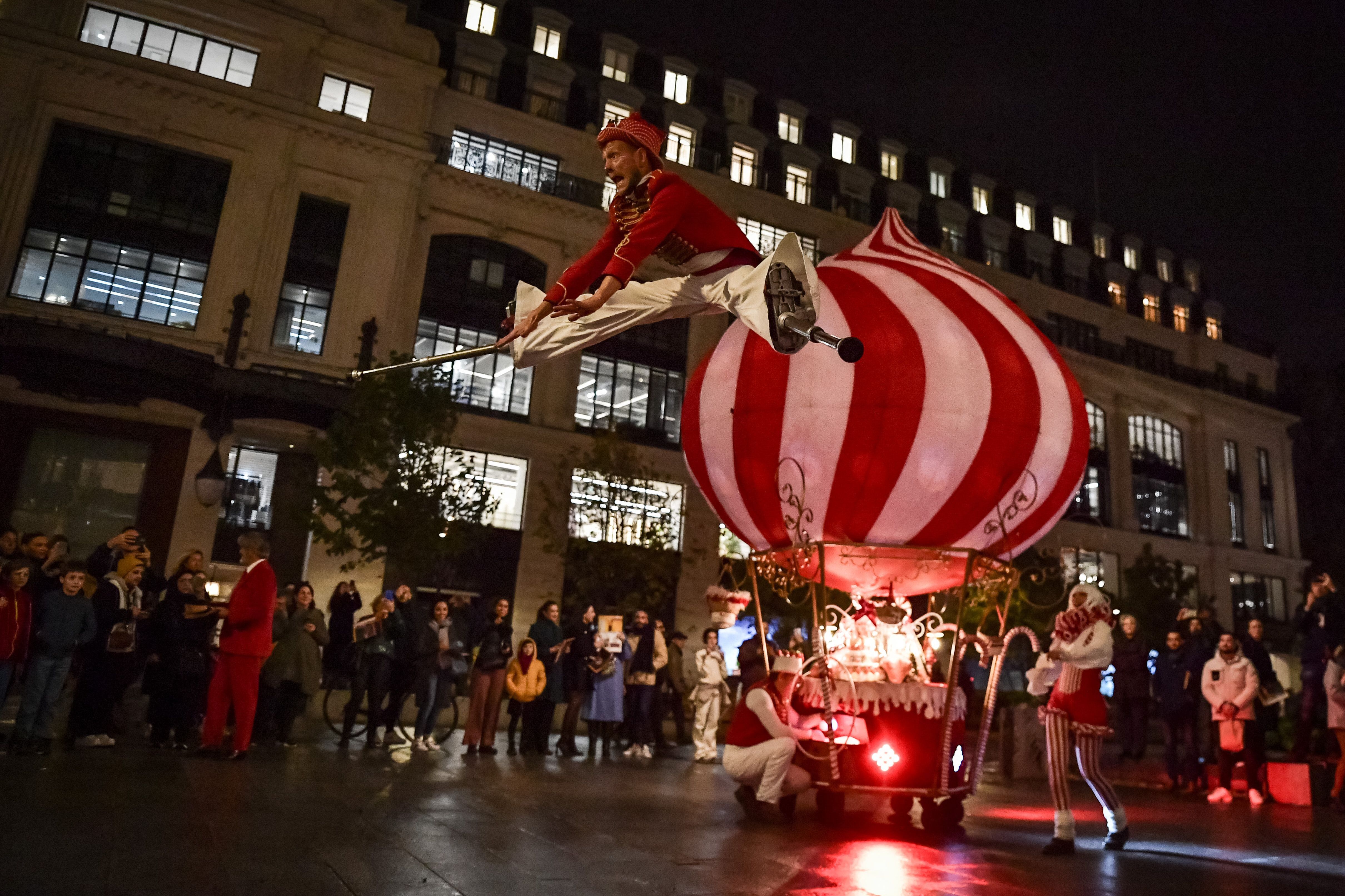 Acrobats perform during the ceremony of Samaritaine's Christmas window displays revealing in Paris on November 8, 2023. Since 1869, La Samaritaine, with its boldly-lettered Art Nouveau facade looming over the Seine River and the Pont Neuf bridge, had been a reliable fixture in the city landscape. But due to major building safety concerns and some dubious business decisions, the nineteenth-century store so dear to many Parisians closed its doors in 2005. Fifteen years after its closure, La Samaritaine re-opened in June 2021 after an extensive revamp. (Photo by ABACA Press/Rex Features/Shutterstock)