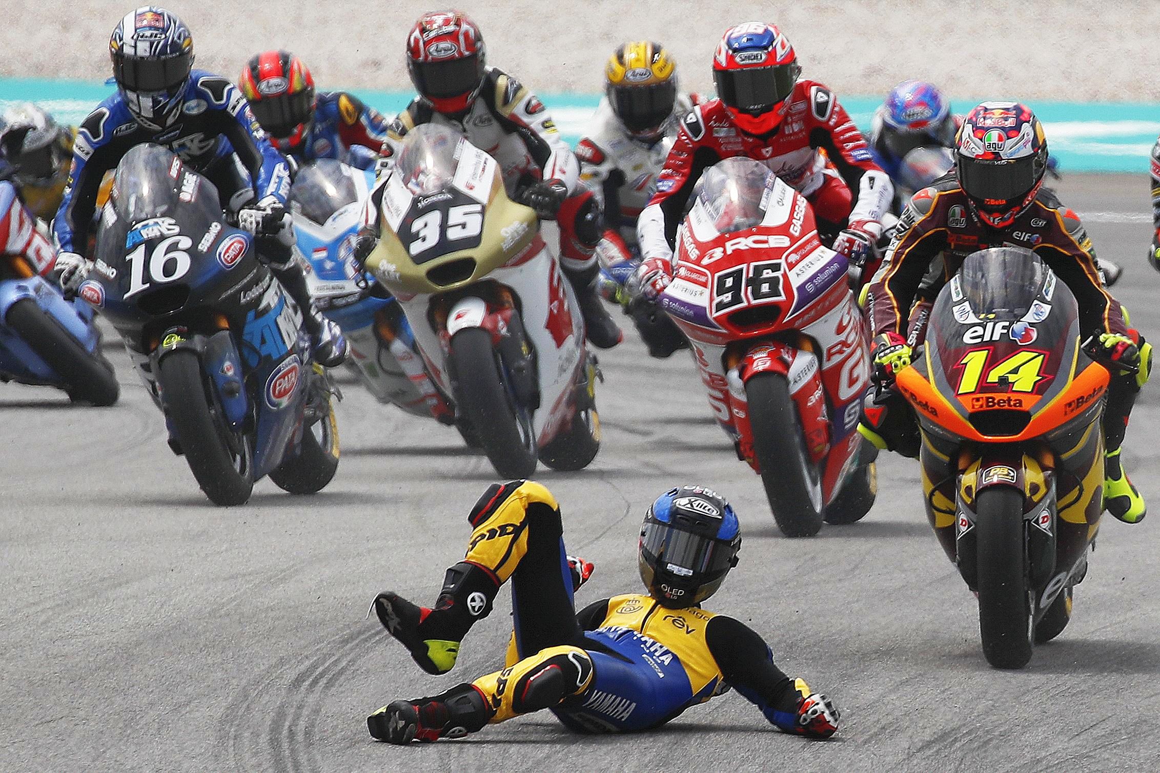 Spanish Moto2 Rider Manuel Gonzalez of Correos Prepago Yamaha VR46 Team falls during Moto2 class race of the Malaysia Motorcycling Grand Prix 2023 in Petronas Sepang International Circuit, Malaysia on November 12, 2023. (Photo by Fazry Ismail/EPA/EFE)