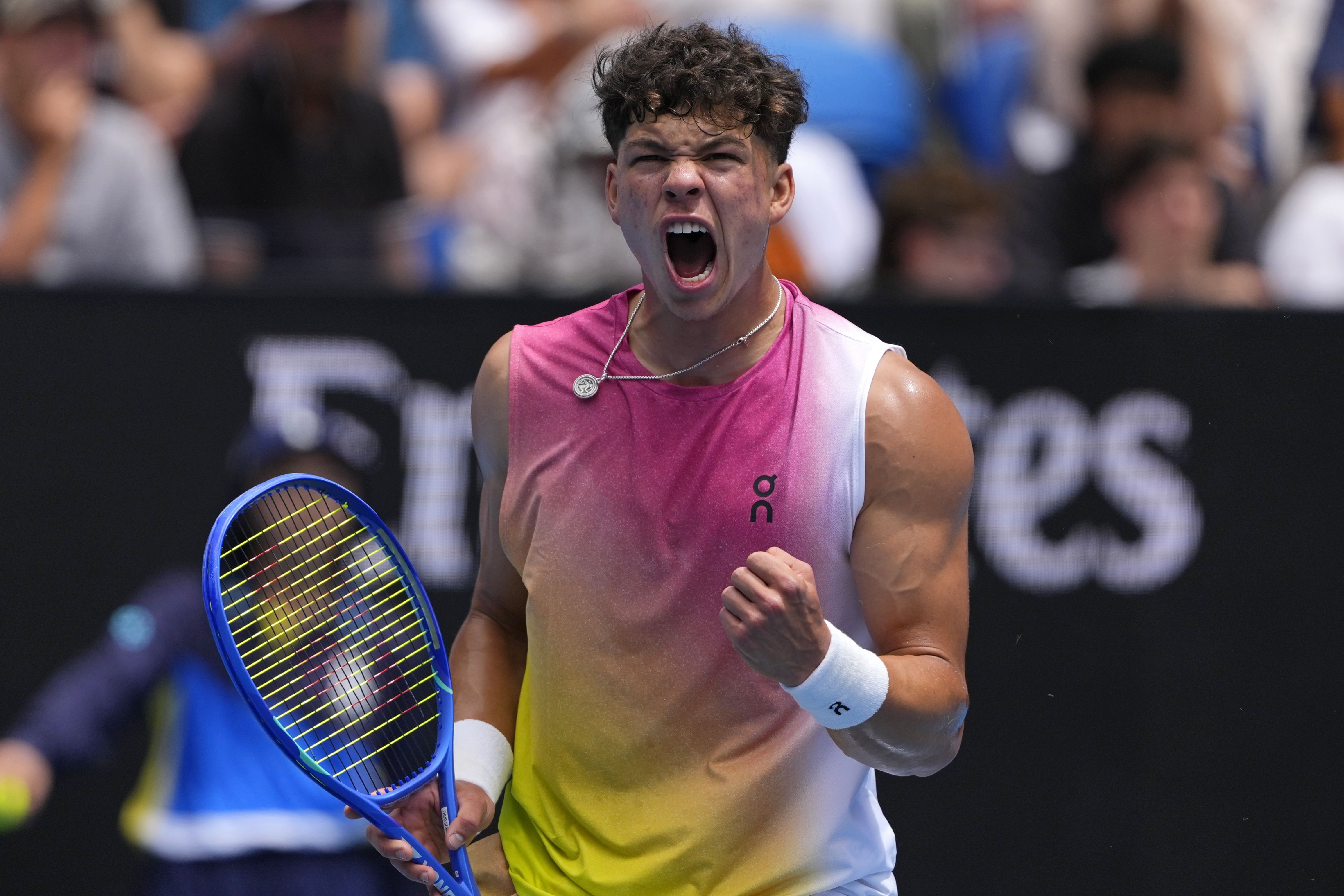 Ben Shelton of the U.S. reacts after winning a point against Pablo Carreno Busta of Spain during their second round match at the Australian Open tennis championship in Melbourne, Australia, Thursday, January 16, 2025. (Photo by Vincent Thian/AP Photo)