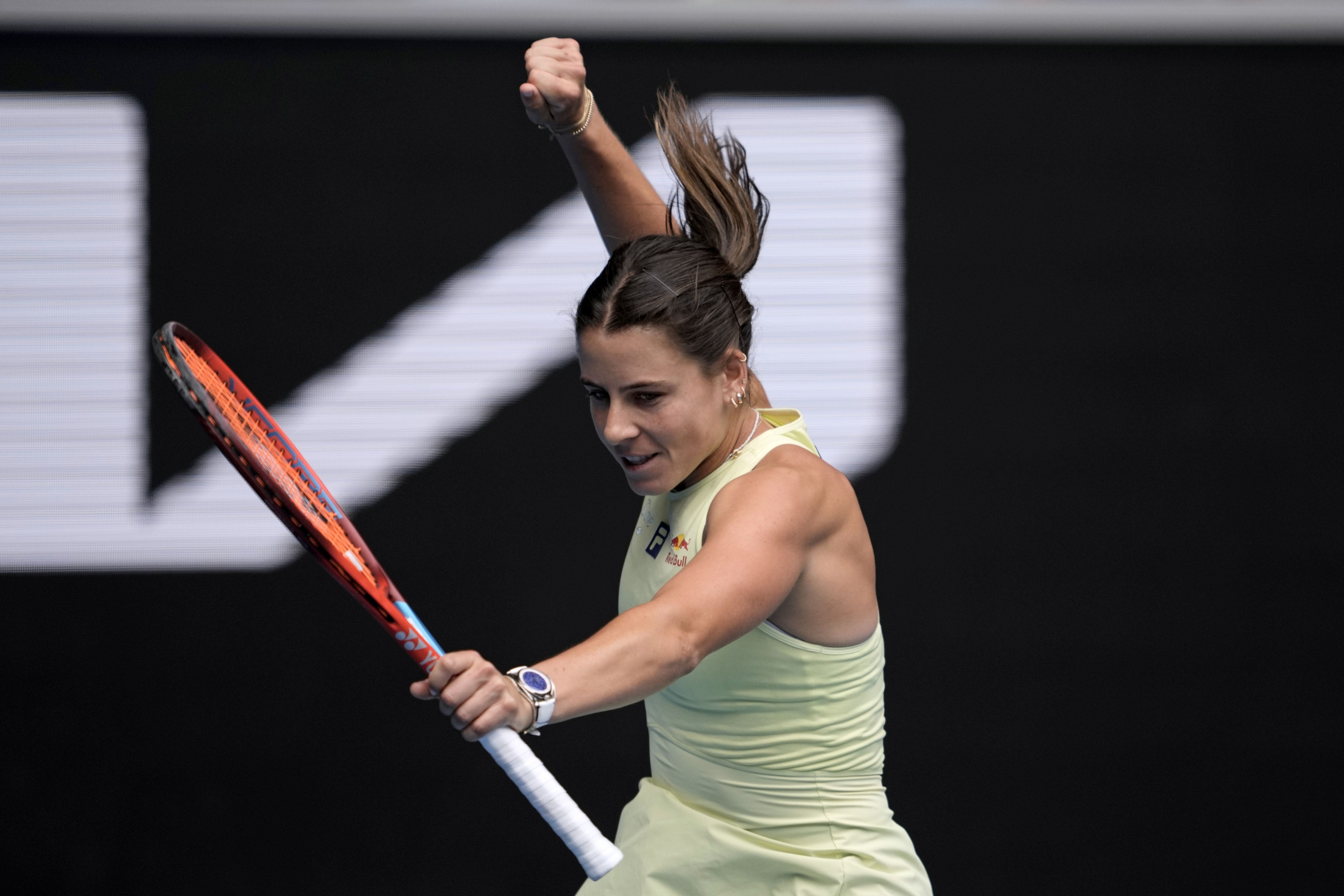 Emma Navarro of the U.S. celebrates after defeating Wang Xiyu of China during their second round match at the Australian Open tennis championship in Melbourne, Australia, Thursday, January 16, 2025. (Photo by Ng Han Guan/AP Photo)