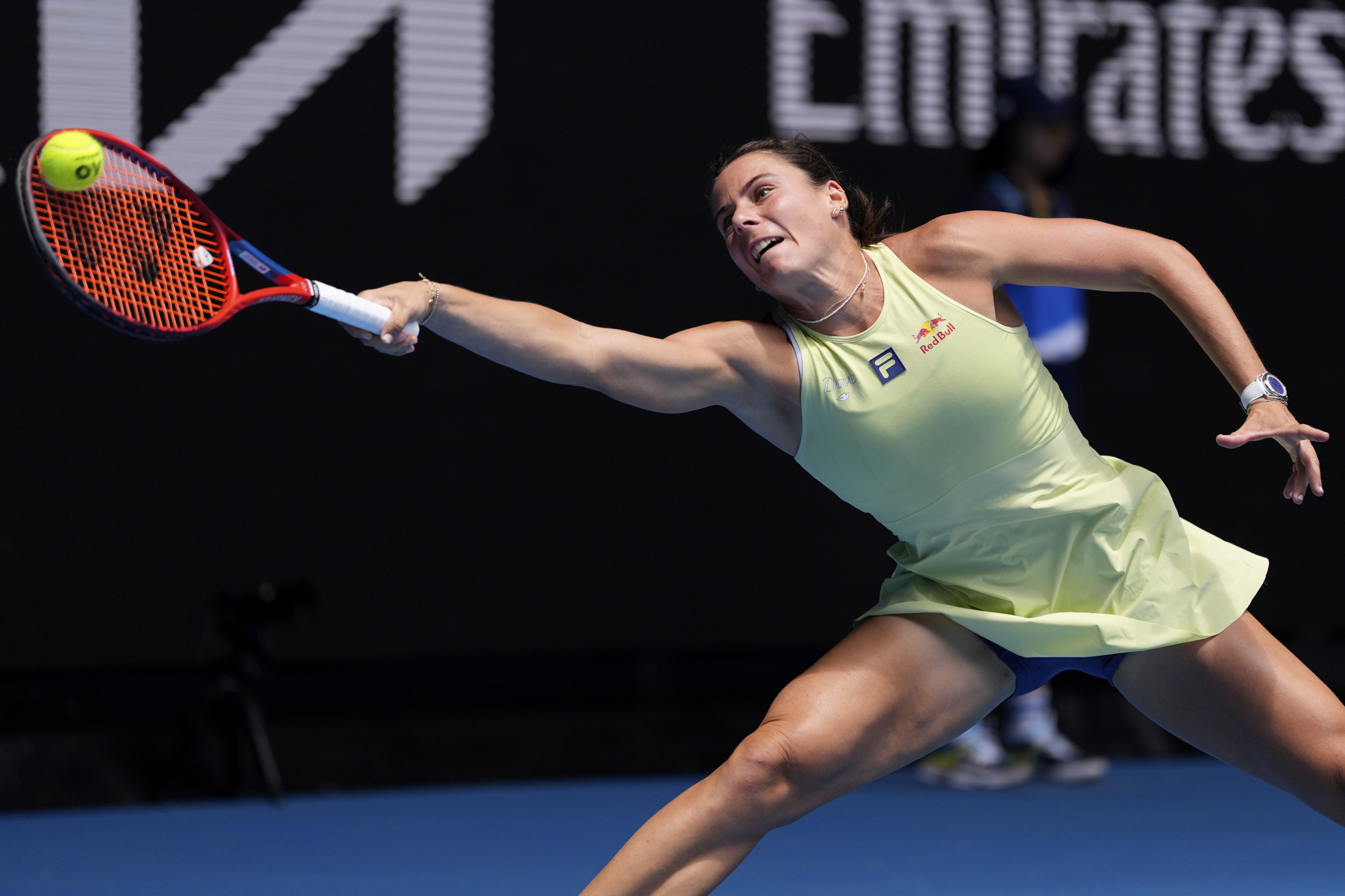 Emma Navarro of the U.S. plays a forehand return to Wang Xiyu of China during their second round match at the Australian Open tennis championship in Melbourne, Australia, Thursday, January 16, 2025. (Photo by Ng Han Guan/AP Photo)