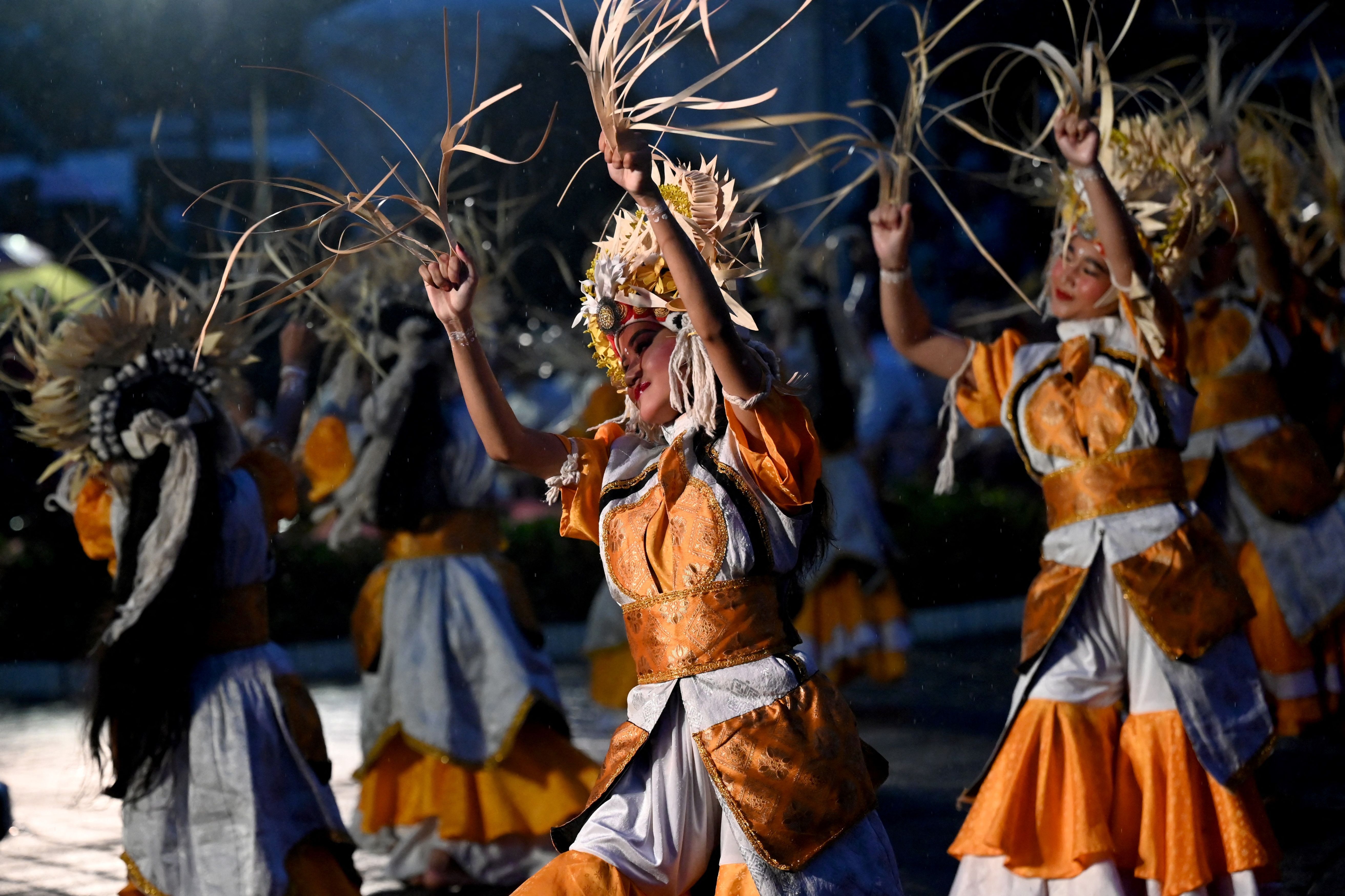 Balinese traditional dancers perform during the dance of releasing the sun 2024, welcoming the sun 2025 a New Year's Eve celebration in Denpasar on Indonesia's resort island of Bali on December 31, 2024. (Photo by Sonny Tumbelaka/AFP Photo)