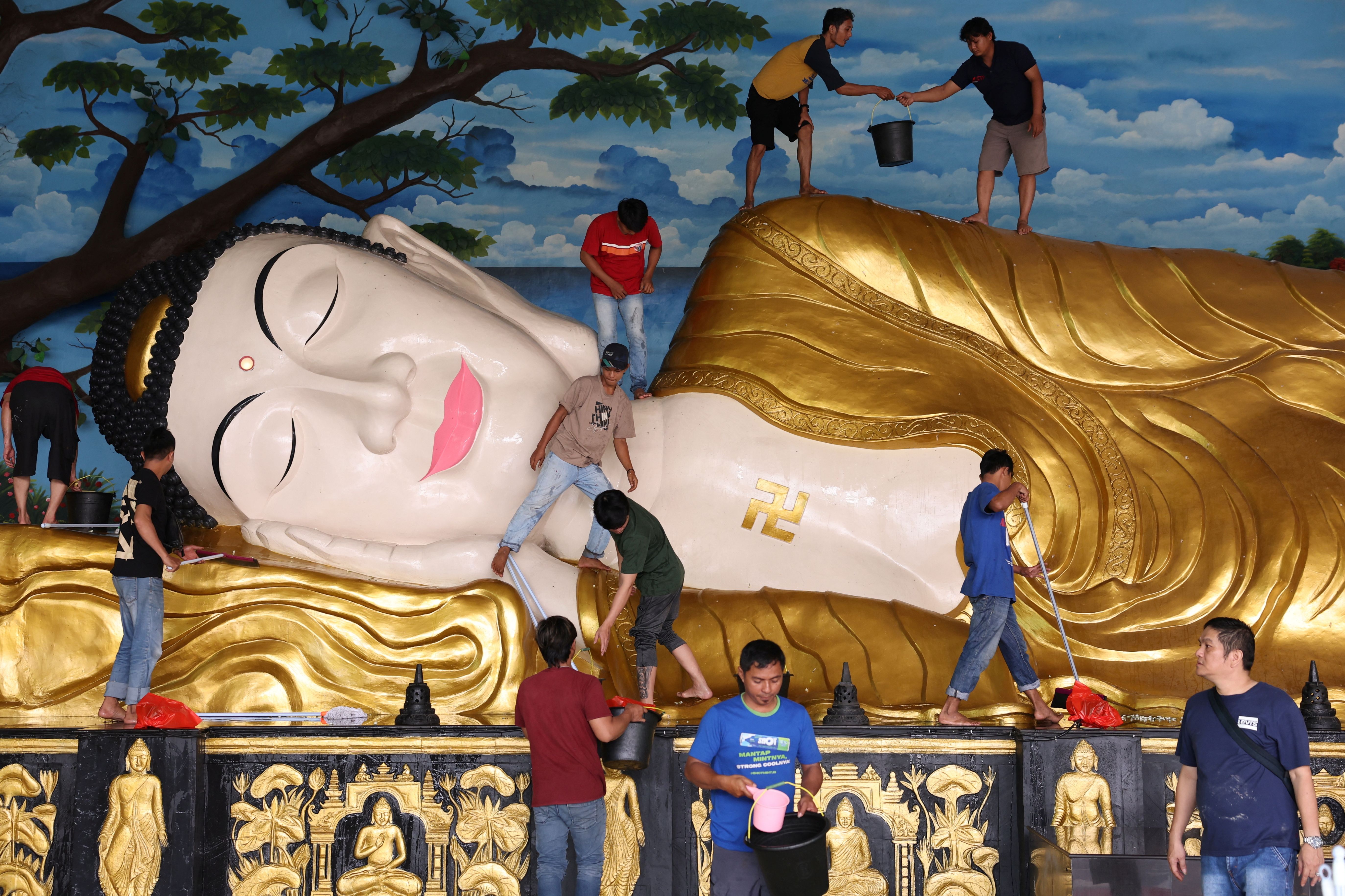 People clean a sleeping Buddha statue ahead of the Chinese Lunar New Year celebration, Year of the Wood Snake at the Buddha Dharma and 8 Po Sat temple in Bogor, West Java province, Indonesia, on January 19, 2025. (Photo by Ajeng Dinar Ulfiana/Reuters)