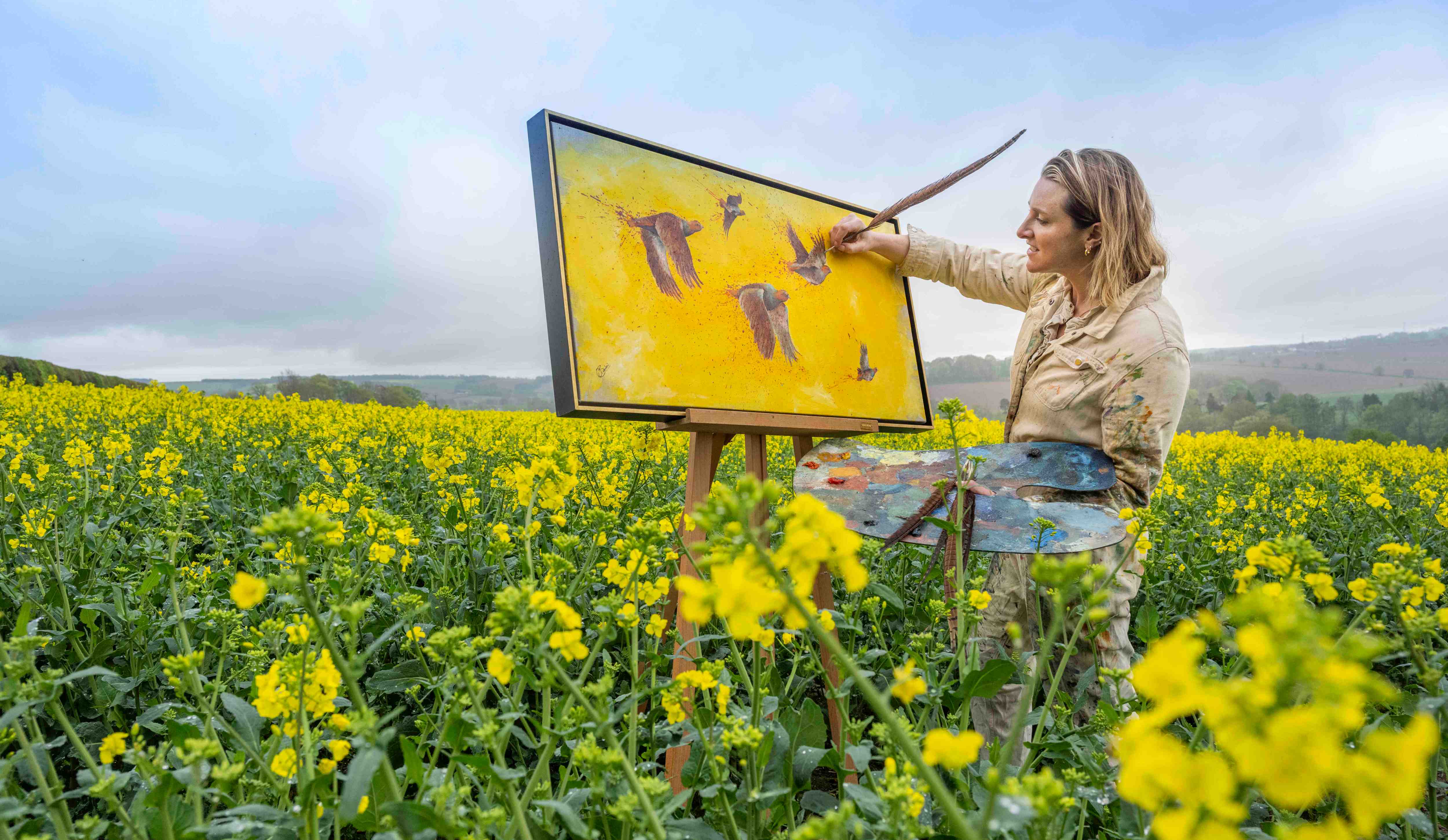 Clare Brownlow, an artist based in the Scottish Borders, in the first decade of May 2024 shows off her new work, English Partridge in a Field of Rape Seed. Brownlow specialises in painting with a pheasant feather and inks. (Photo by Phil Wilkinson/The Times)