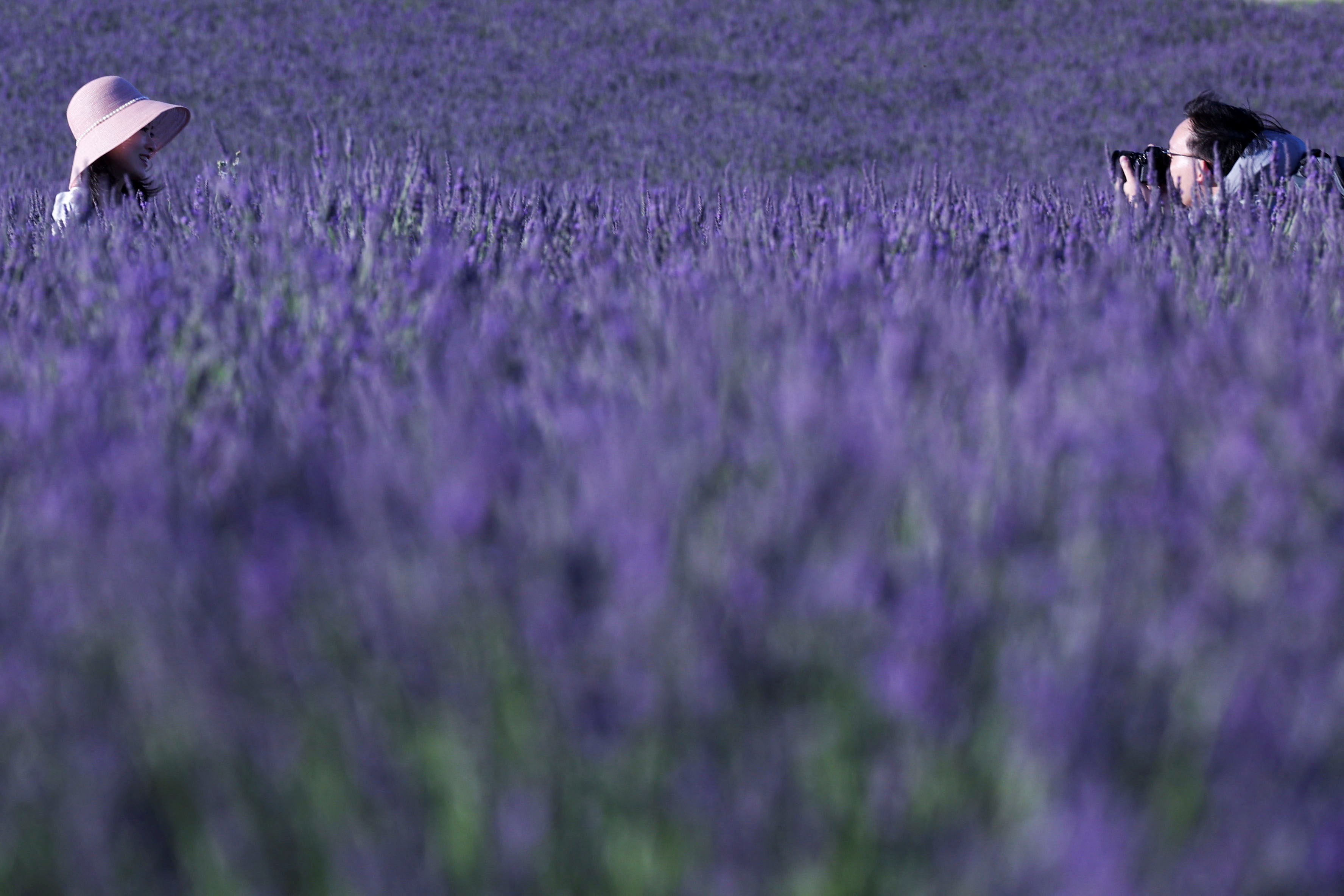 Tourists take pictures a in lavender field in Valensole, South of France on July 3, 2024. (Photo by Manon Cruz/Reuters)