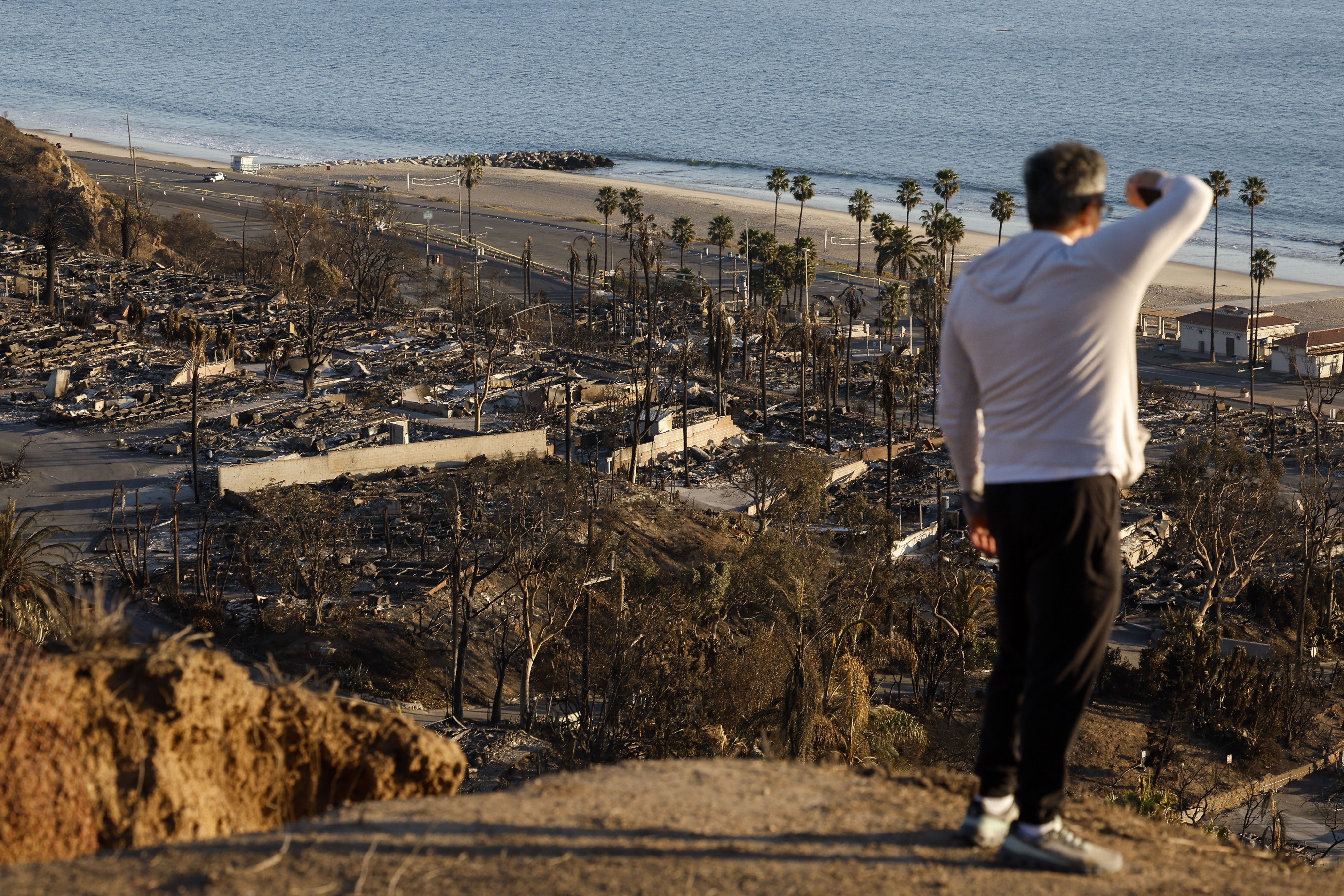 A person looks out over the remains of a burned down neighborhood in the Pacific Palisades neighborhood in Los Angeles, California, USA, 15 January 2025. According to the National Weather Service, much of Southern California is under an elevated fire risk, as the Santa Ana winds have returned and are predicted to affect the area. The Los Angeles County Medical Examiner's Office has stated that the suspected death toll from the Los Angeles fires now stands at 25 as search and rescue teams, both local and abroad, search the affected fire areas. (Photo by Caroline Brehman/EPA/EFE)