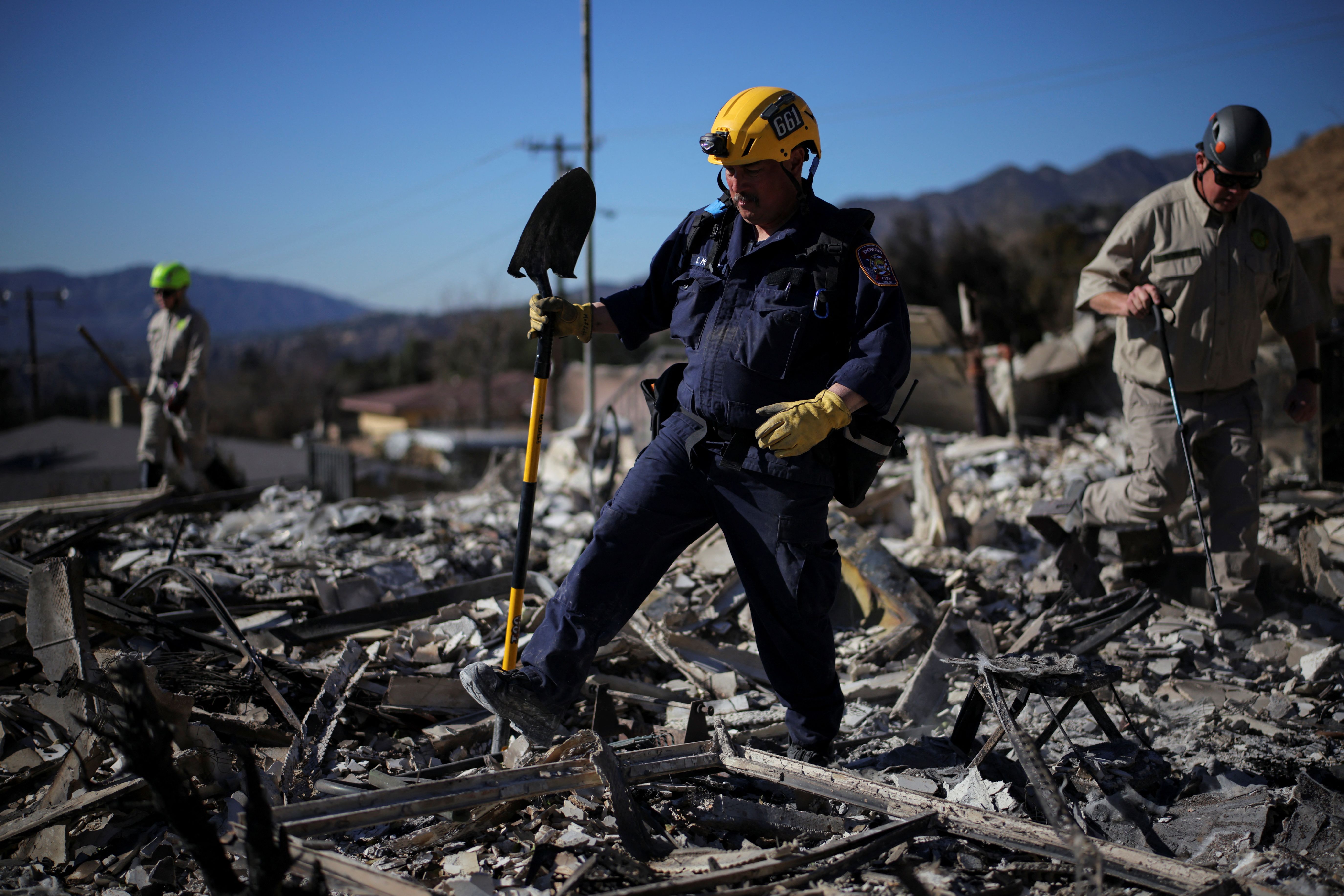 A search and rescue worker investigates the charred remains of a house, as the Eaton Fire continues, in Altadena, Los Angeles County, California, on January 15, 2025. (Photo by Daniel Cole/Reuters)