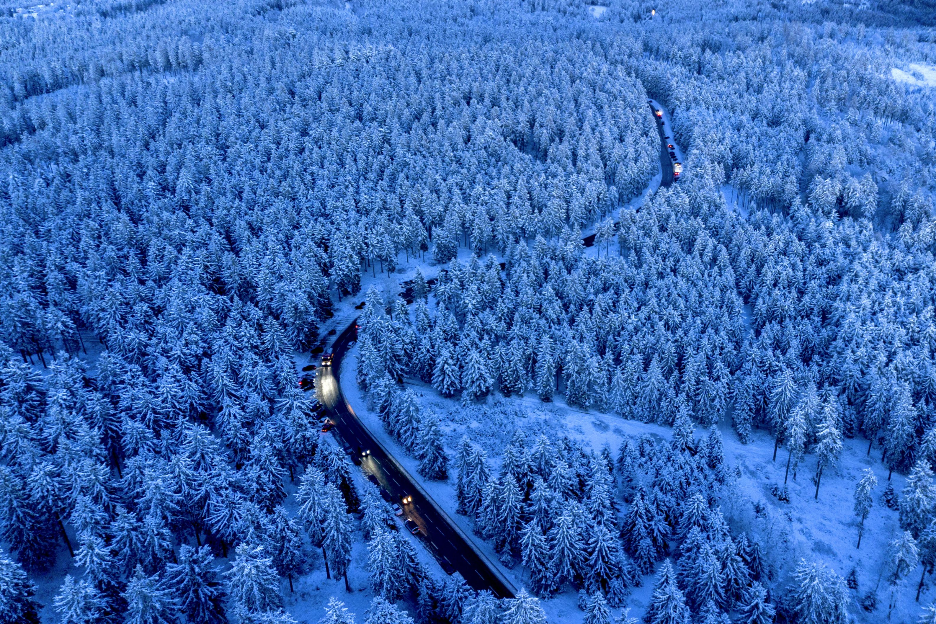 Cars drive up to the top of the Feldberg mountain near Frankfurt, Germany, Thursday evening, January 2, 2025. (Photo by Michael Probst/AP Photo)