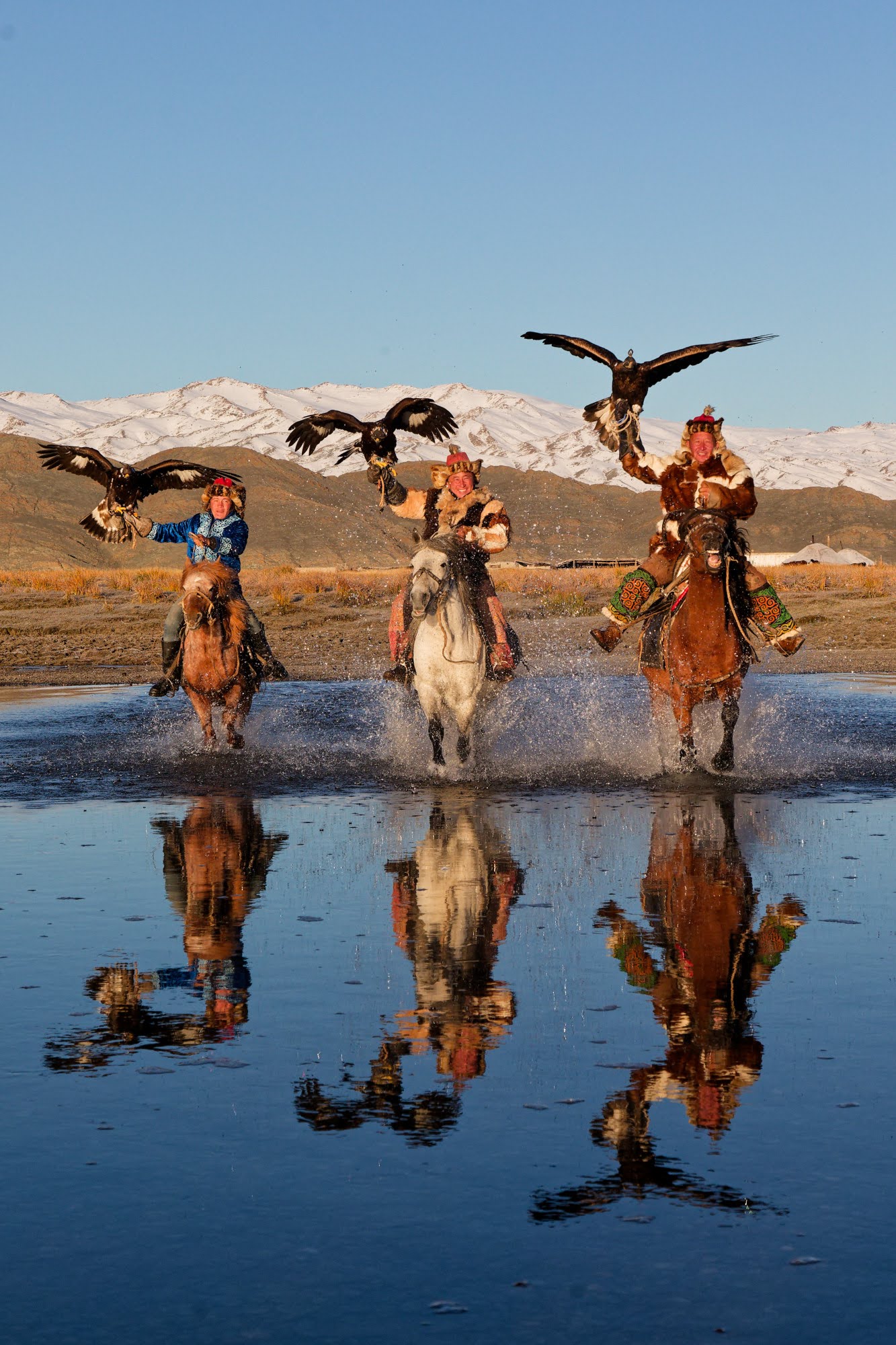 Seventh and eighth generation eagle hunters are among those taking part in the Altai Eagle Festival in Bayan-Olgii province, Eastern Kazakhstan on January 10, 2025. The festival is a celebration of Kazakh culture and its tournaments include eagle calling and retrieving a coin from the ground while on horseback. (Photo by Marie Carmen Huges/Media Drum Images)