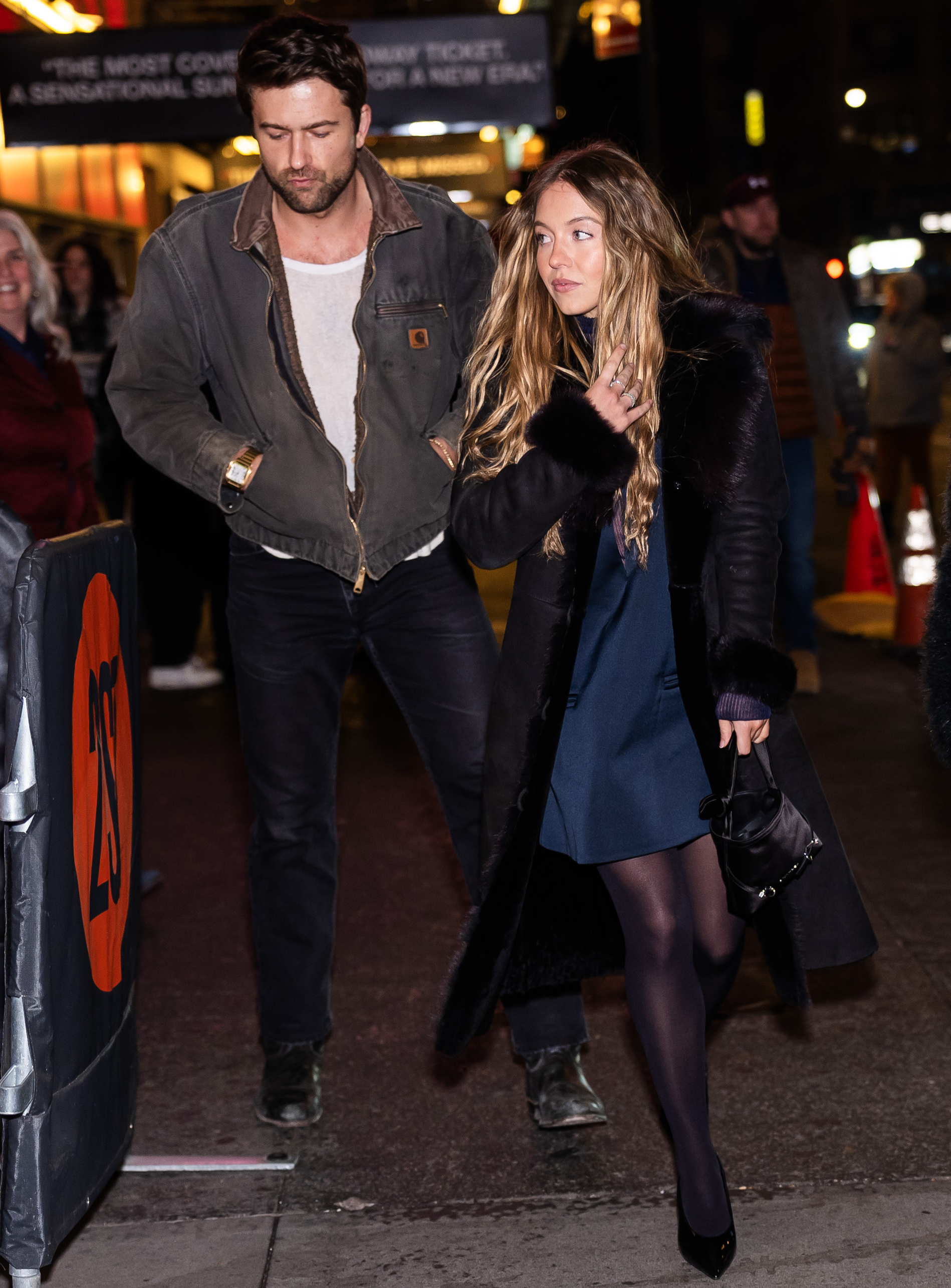 American actor Brandon Sklenar (L) and American actress Sydney Sweeney (C) attend “Cult of Love” on Broadway in Midtown on January 11, 2025 in New York City. (Photo by TheStewartofNY/GC Images)