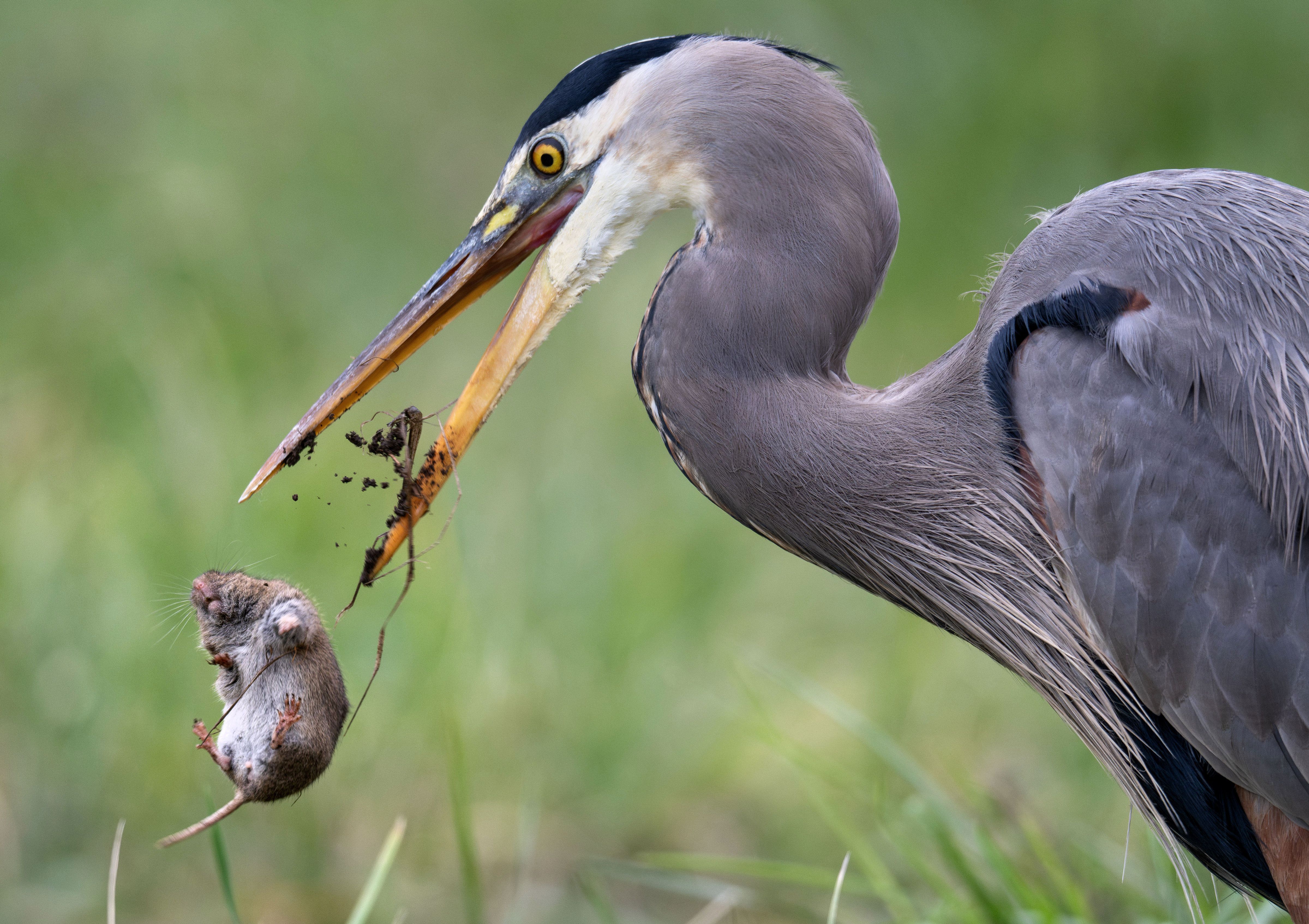 A great blue heron catches a large vole before gulping it down in a roadside pasture near Elkton in rural southwestern Oregon on January 9, 2025. In winter, some local herons adapt by hunting rodents when nearby rain-swollen rivers run high and fast. (Photo by Robin Loznak/ZUMA Press Wire/Rex Features/Shutterstock)