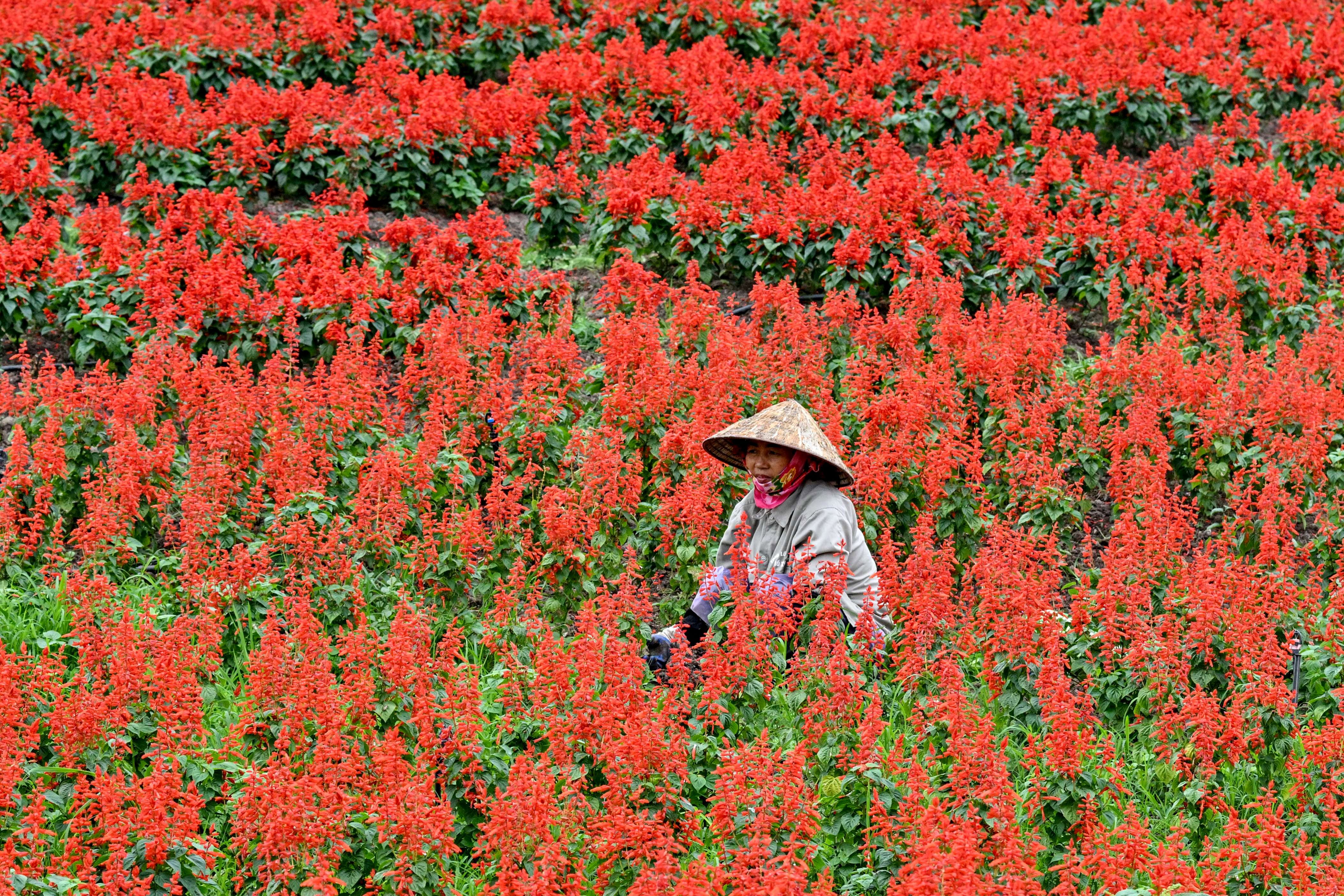 A farm worker tends to flowers in a field in Hanoi on November 27, 2024. (Photo by Nhac Nguyen/AFP Photo)