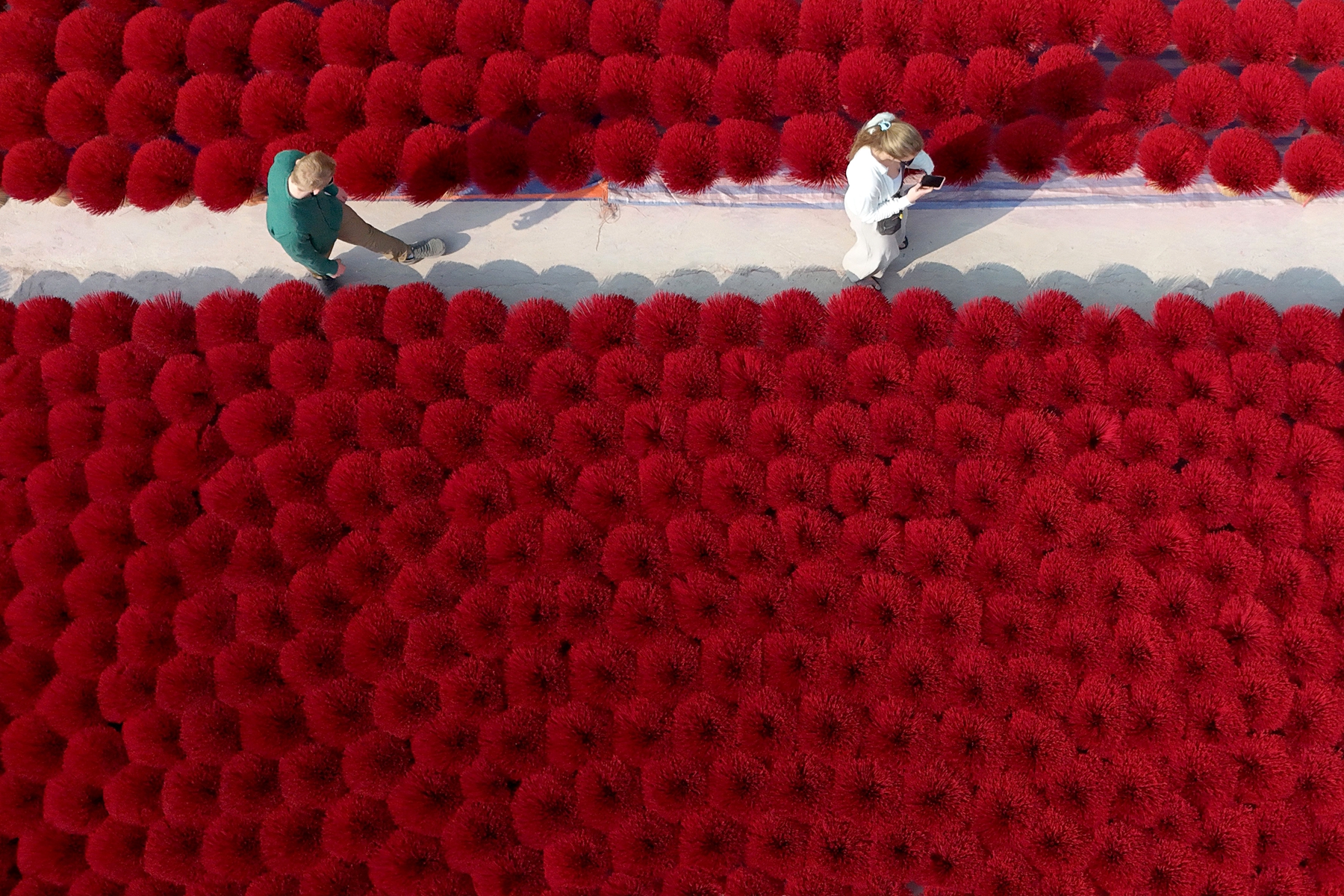 This aerial picture shows tourists walking next to bundles of incense sticks in Quang Phu Cau village on the outskirts of Hanoi on January 21, 2025, ahead of Lunar New Year celebrations, known in Vietnam as Tet. (Photo by Nhac Nguyen/AFP Photo)