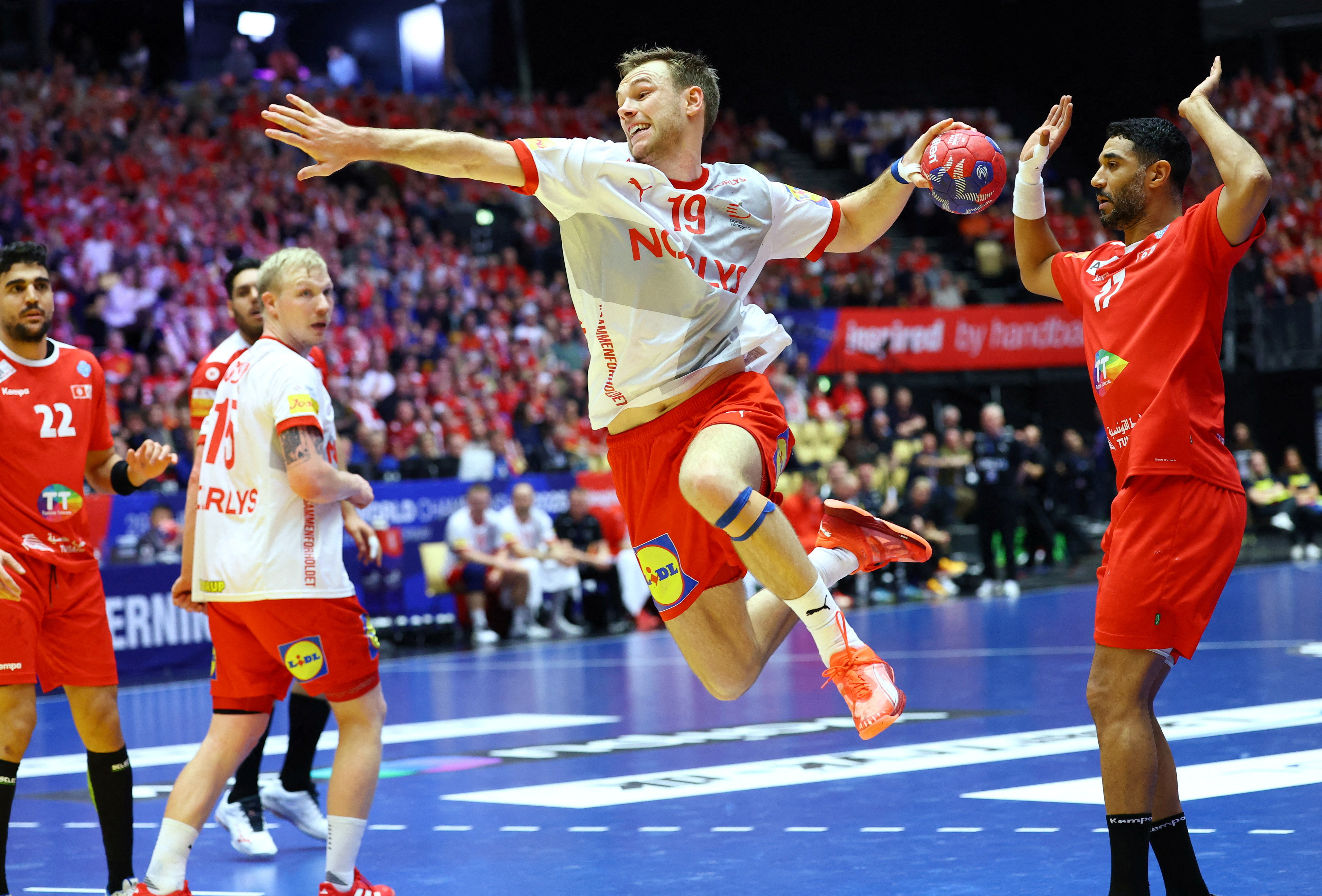 Mathias Gidsel helps the Danes to victory against Tunisia in the preliminary round of the IHF Handball World Championships at the Jyske Bank Boxen arena in Herning, central Denmark on January 16, 2025. (Photo by Bernadett Szabo/Reuters)