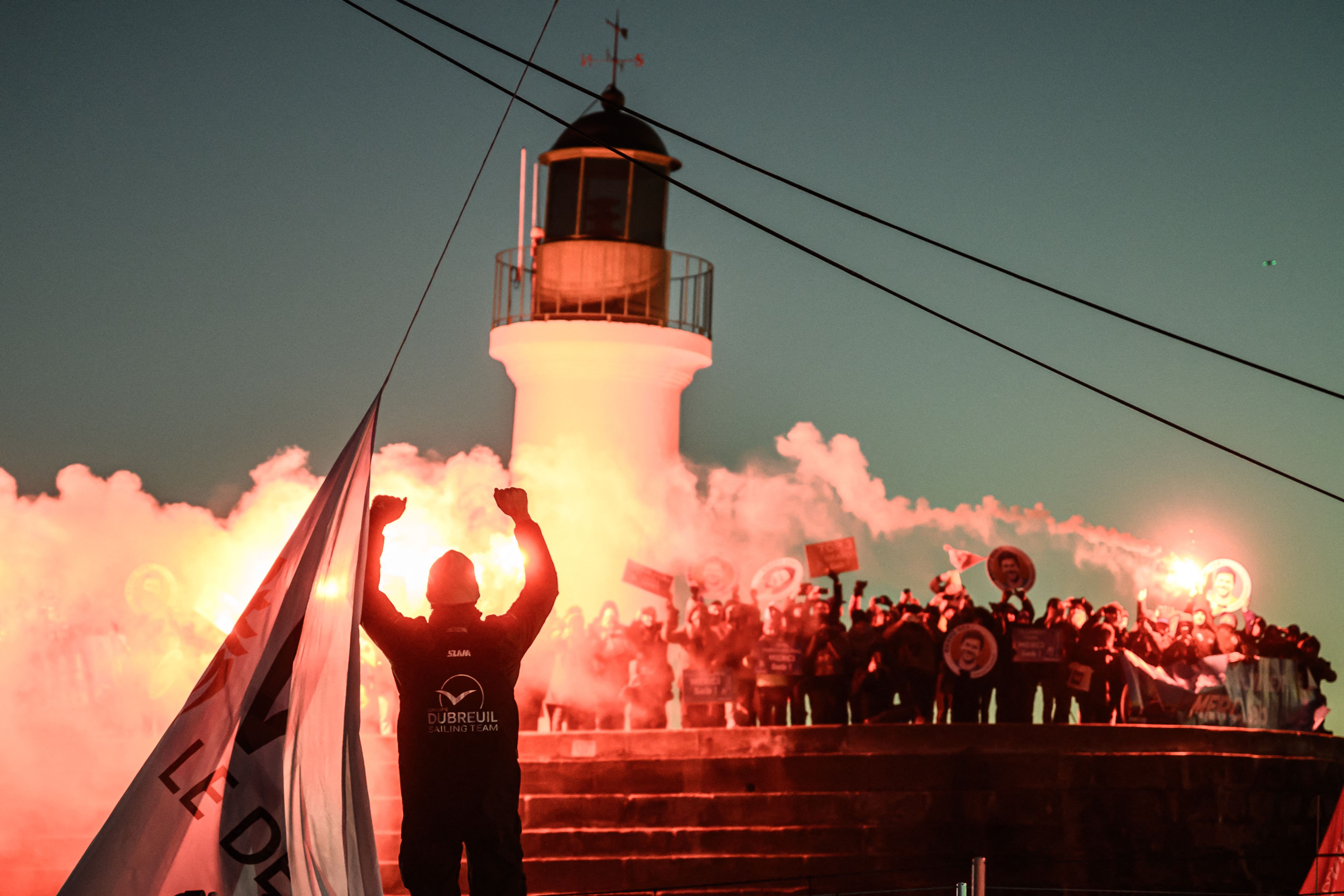 French skipper Sebastien Simon celebrates aboard his Imoca 60 monohull Groupe Dubreuil, while sailing on the Channel after placing third in the 10th edition of the Vendee Globe around the world monohull solo sailing race off Les Sables-d'Olonne, western France on January 17, 2025. (Photo by Loic Venance/AFP Photo)