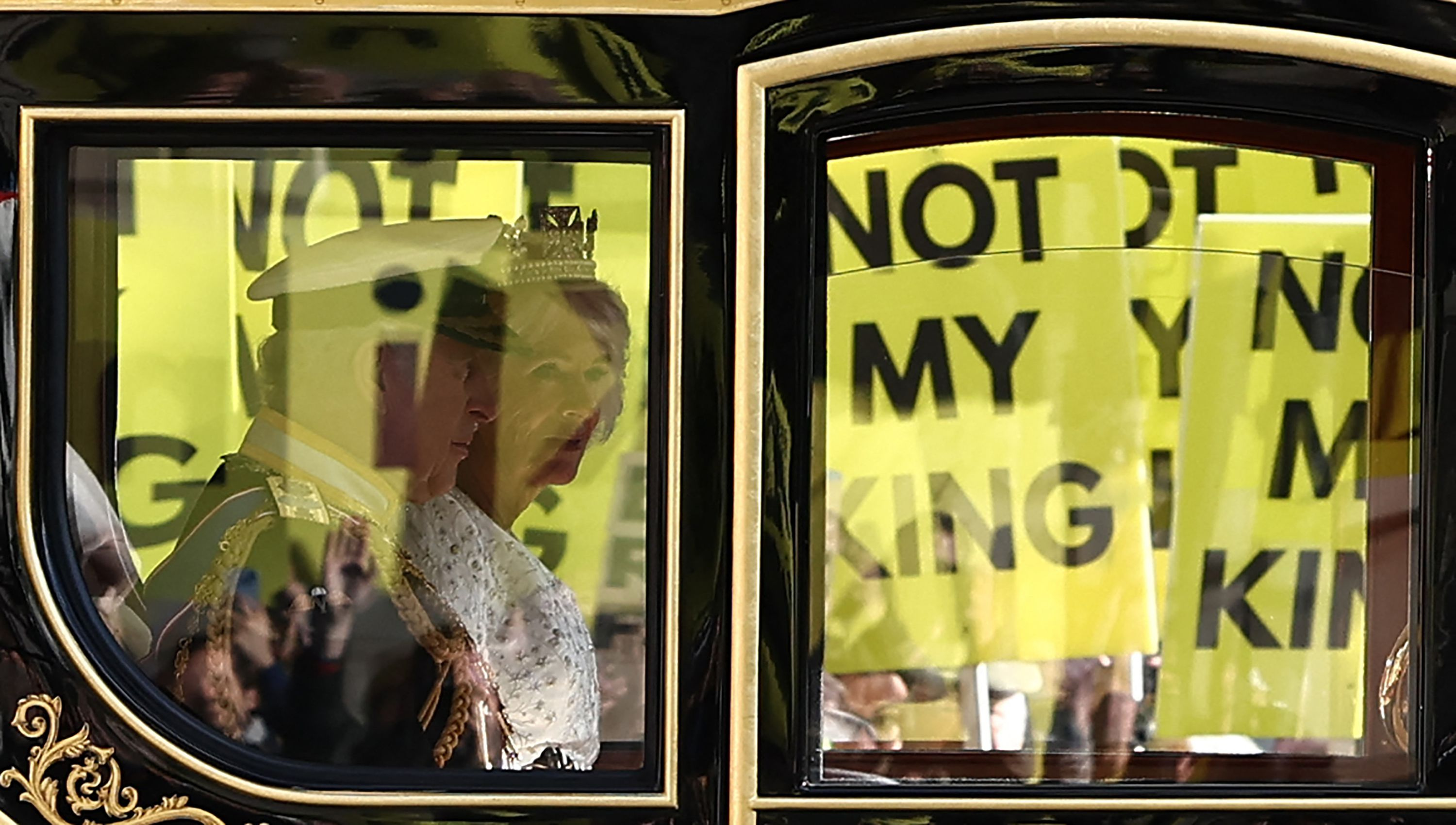 Britain's King Charles III and Britain's Queen Camilla travel in the Diamond Jubilee State Coach past protesters holding “Not My King” placards, from the anti-monarchy group Republic as they demonstrate ahead of the State Opening of Parliament, opposite the Houses of Parliament in London on November 7, 2023. (Photo by Henry Nicholls/AFP Photo)