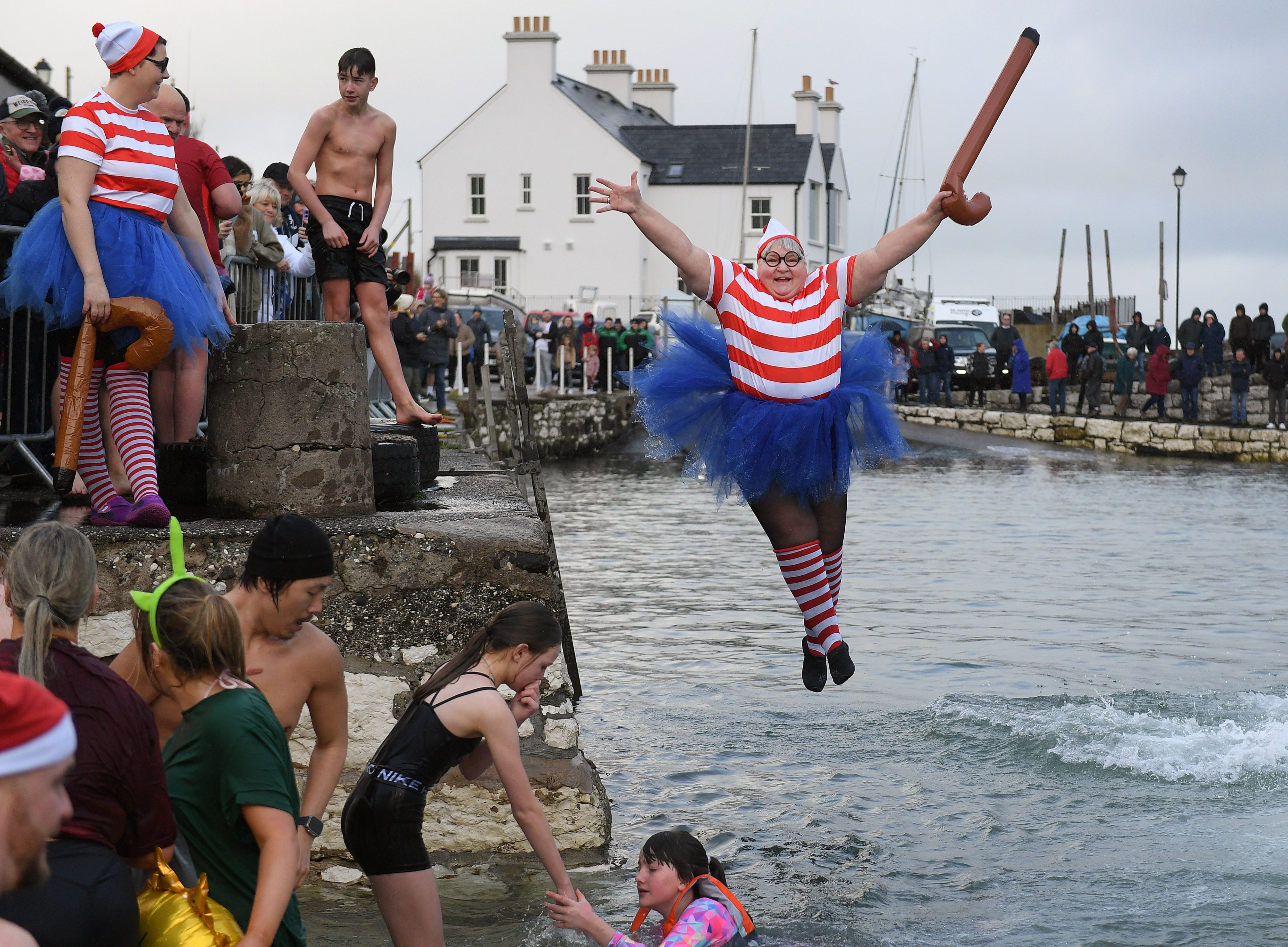 Angela McClements joins fellow New Year's Day celebrants as they dive into Carnlough harbour on January 1, 2025 in Carnlough, Northern Ireland. The annual dive and swim is in aid of charity. (Photo by Charles McQuillan/Getty Images)
