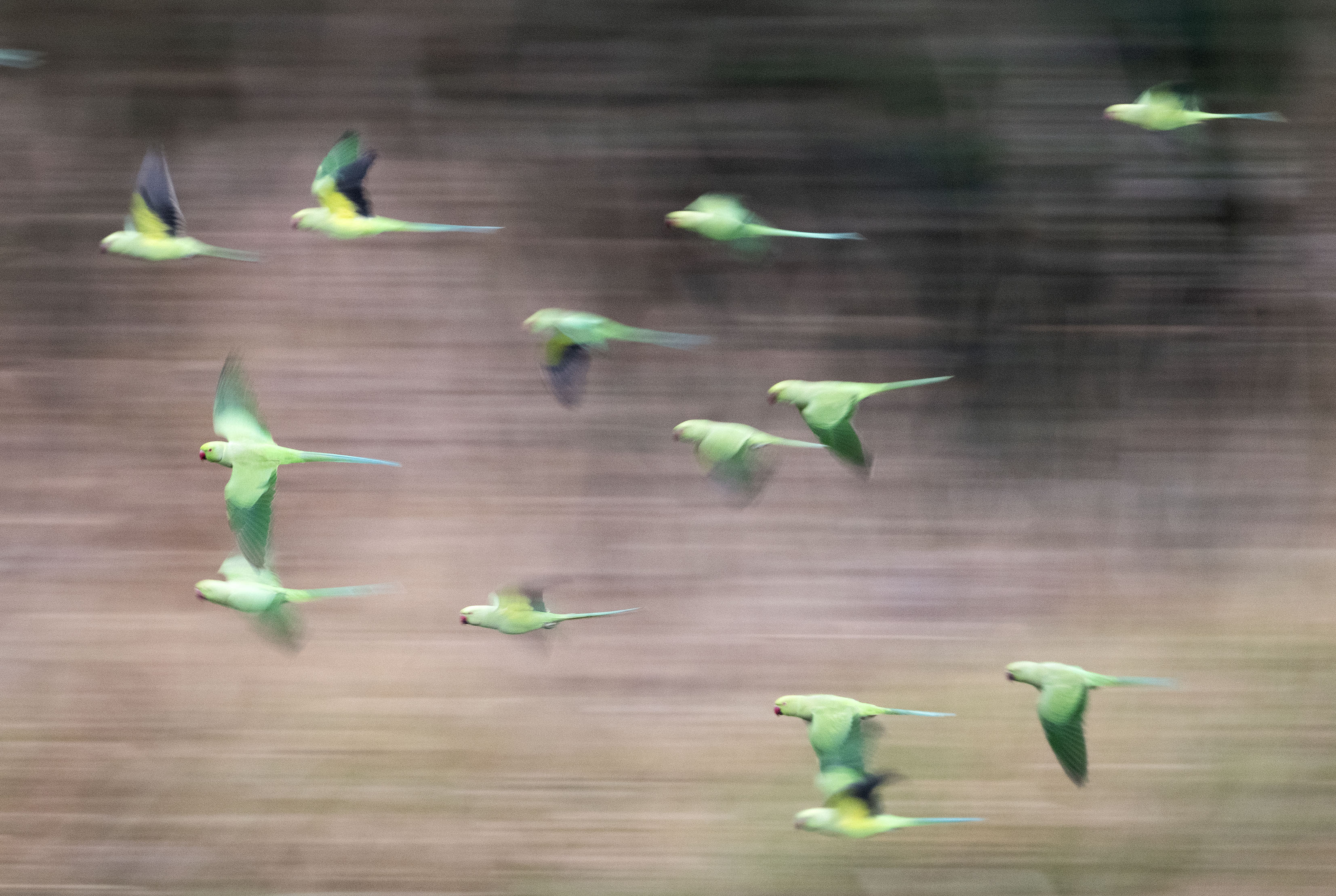 A flock of ring-necked paraqeets flying along the Jubilee River in Dorney, Buckinghamshire on December 31, 2024. They are an introduced species whose numbers are increasing. (Photo by Stan Kujawa/The Times)