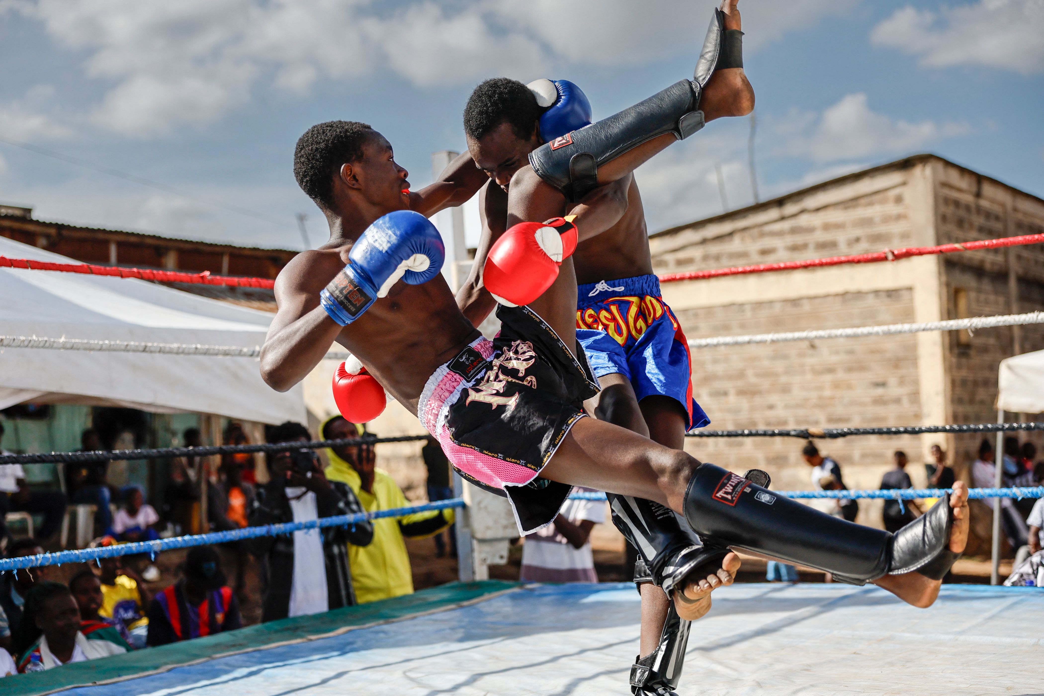 Muay Thai participants, fight during the Kibra Youth Initiative boxing exhibition at the Kibera Fort Jesus grounds in Nairobi on December 23, 2024. The purpose of the boxing exhibition is to promote boxing and Muay Thai in the local communities and help prevention of crime and substance abuse among the growing youth within the area and surrounding communities. (Photo by Simon Maina/AFP Photo)