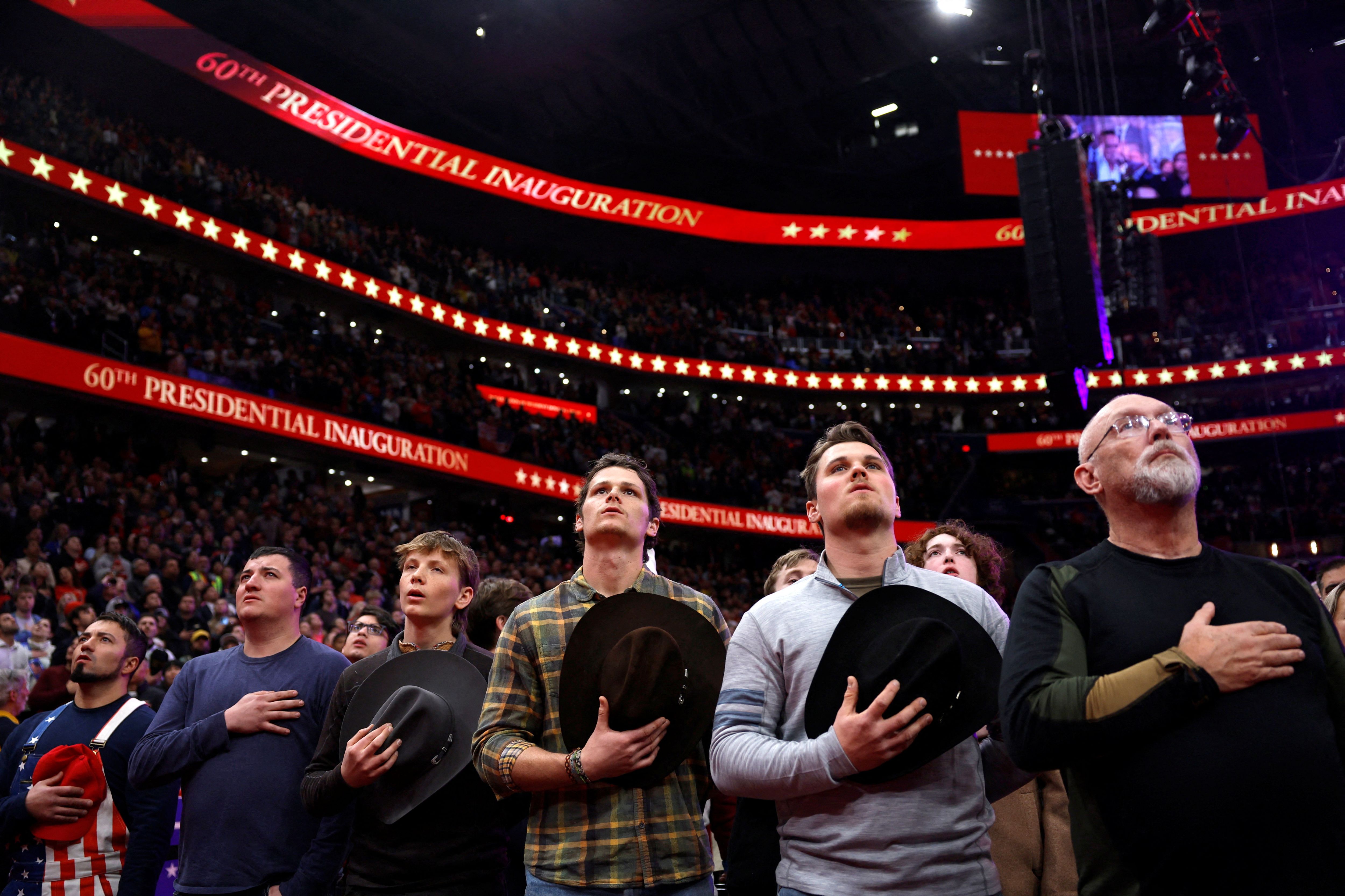 Attendees hold their hats during the national anthem on the inauguration day of Donald Trump's second presidential term, inside Capital One arena, in Washington on January 20, 2025. (Photo by Amanda Perobelli/Reuters)