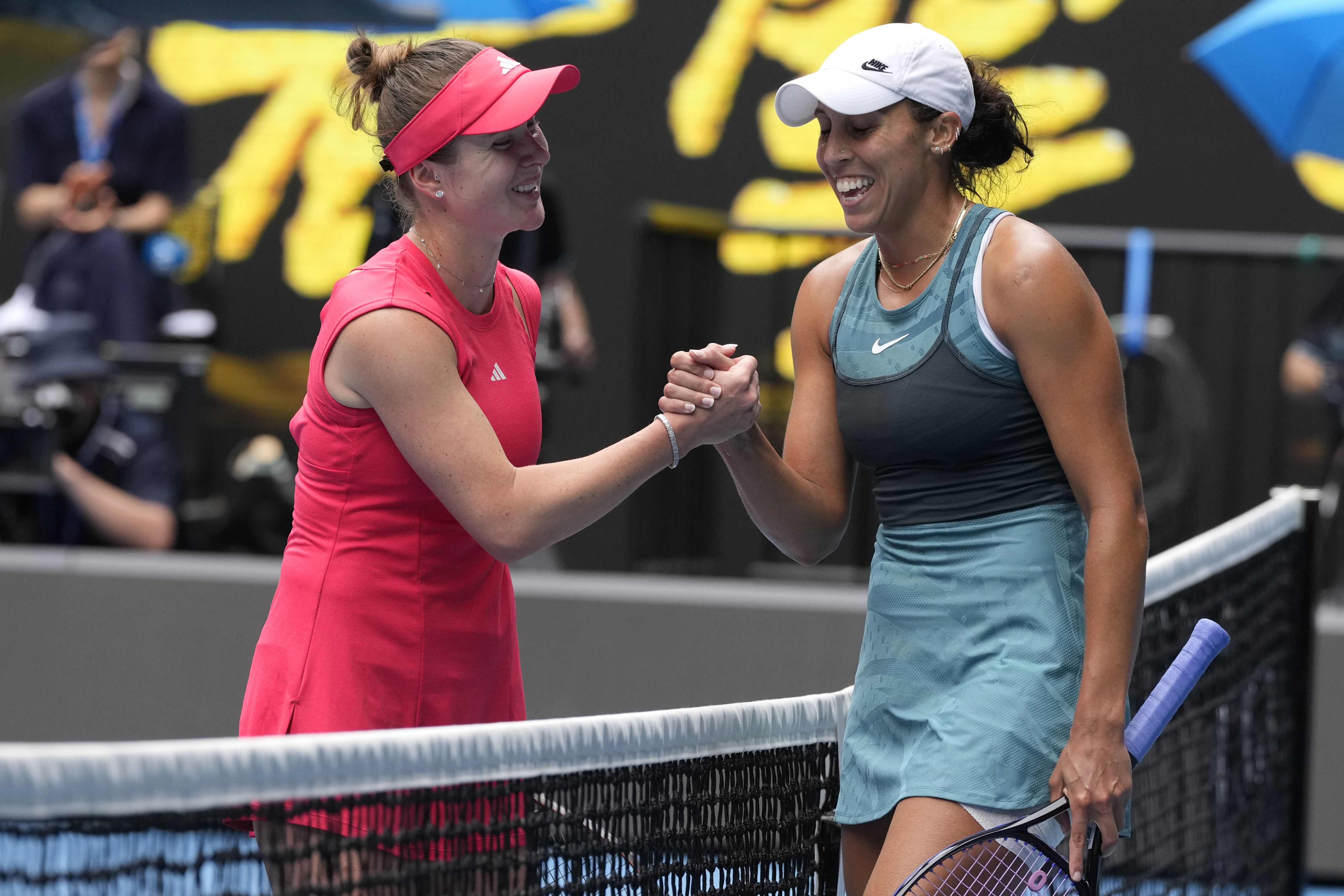 Madison Keys, right, of the U.S. is congratulated by Elina Svitolina of Ukraine following their quarterfinal match at the Australian Open tennis championship in Melbourne, Australia, Wednesday, January 22, 2025. (Photo by Manish Swarup/AP Photo)