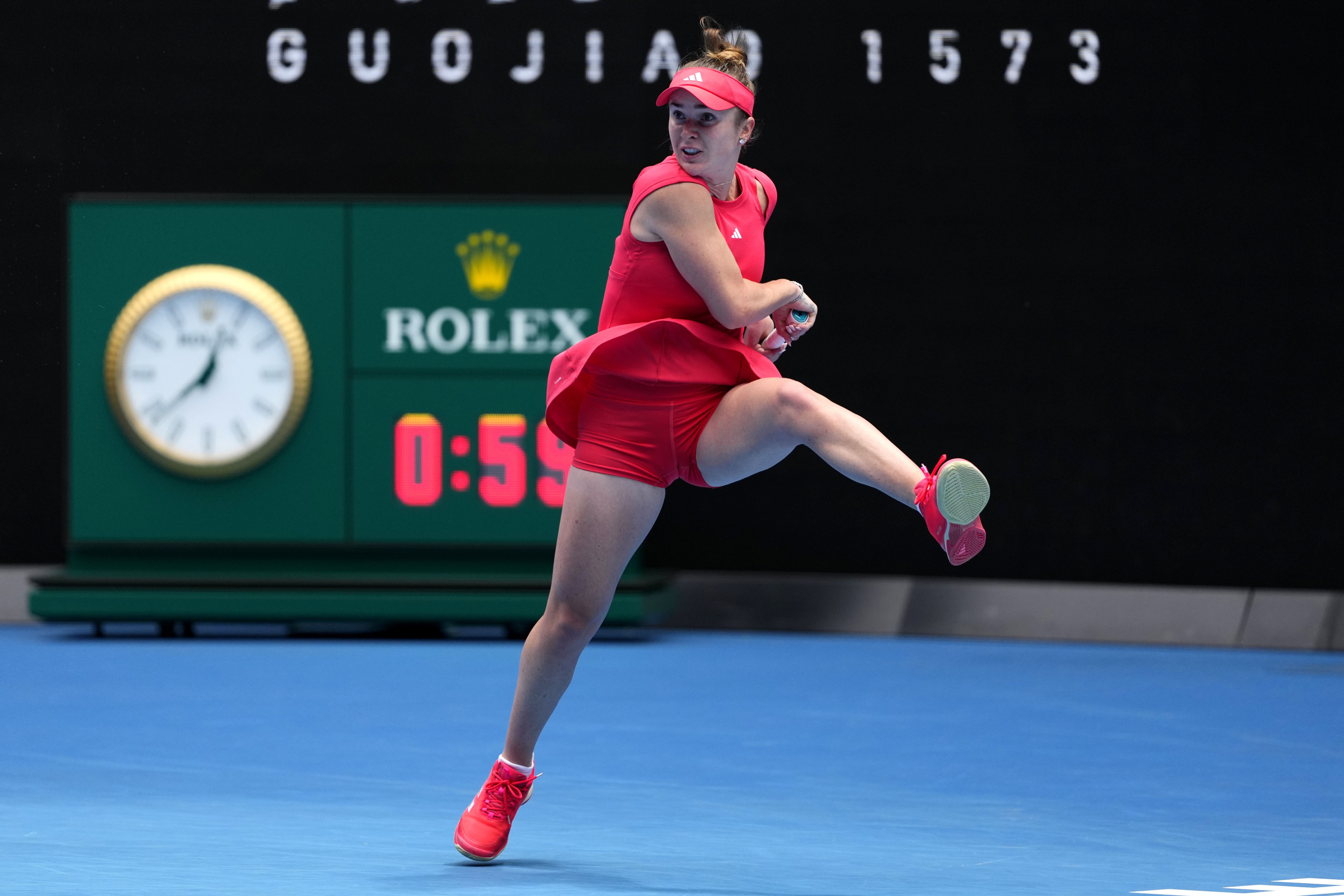 Elina Svitolina of Ukraine plays a forehand return to Madison Keys of the U.S. during their quarterfinal match at the Australian Open tennis championship in Melbourne, Australia, Wednesday, January 22, 2025. (Photo by Vincent Thian/AP Photo)
