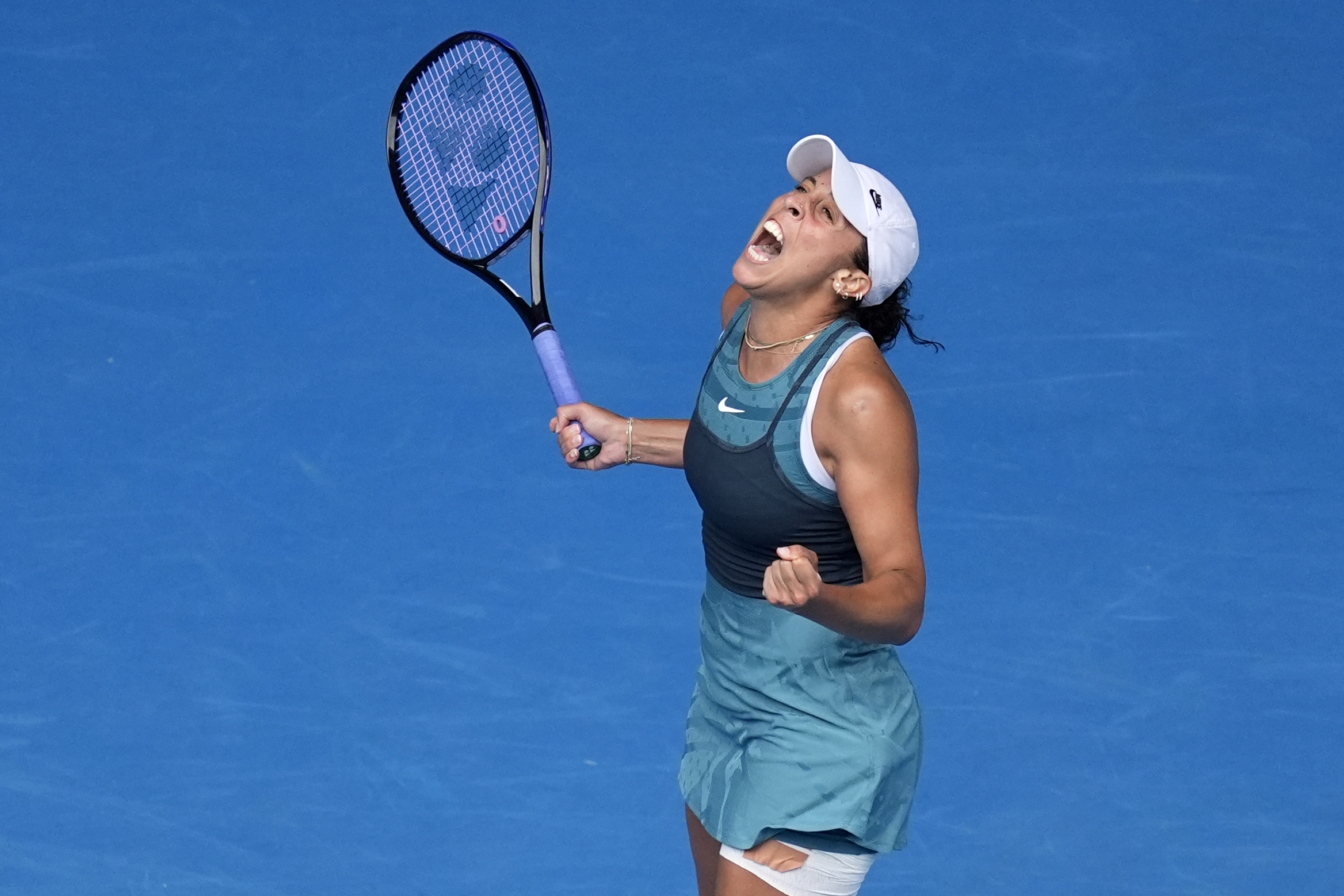Madison Keys of the U.S. celebrates after defeating Elina Svitolina of Ukraine in their quarterfinal match at the Australian Open tennis championship in Melbourne, Australia, Wednesday, January 22, 2025. (Photo by Asanka Brendon Ratnayake/AP Photo)
