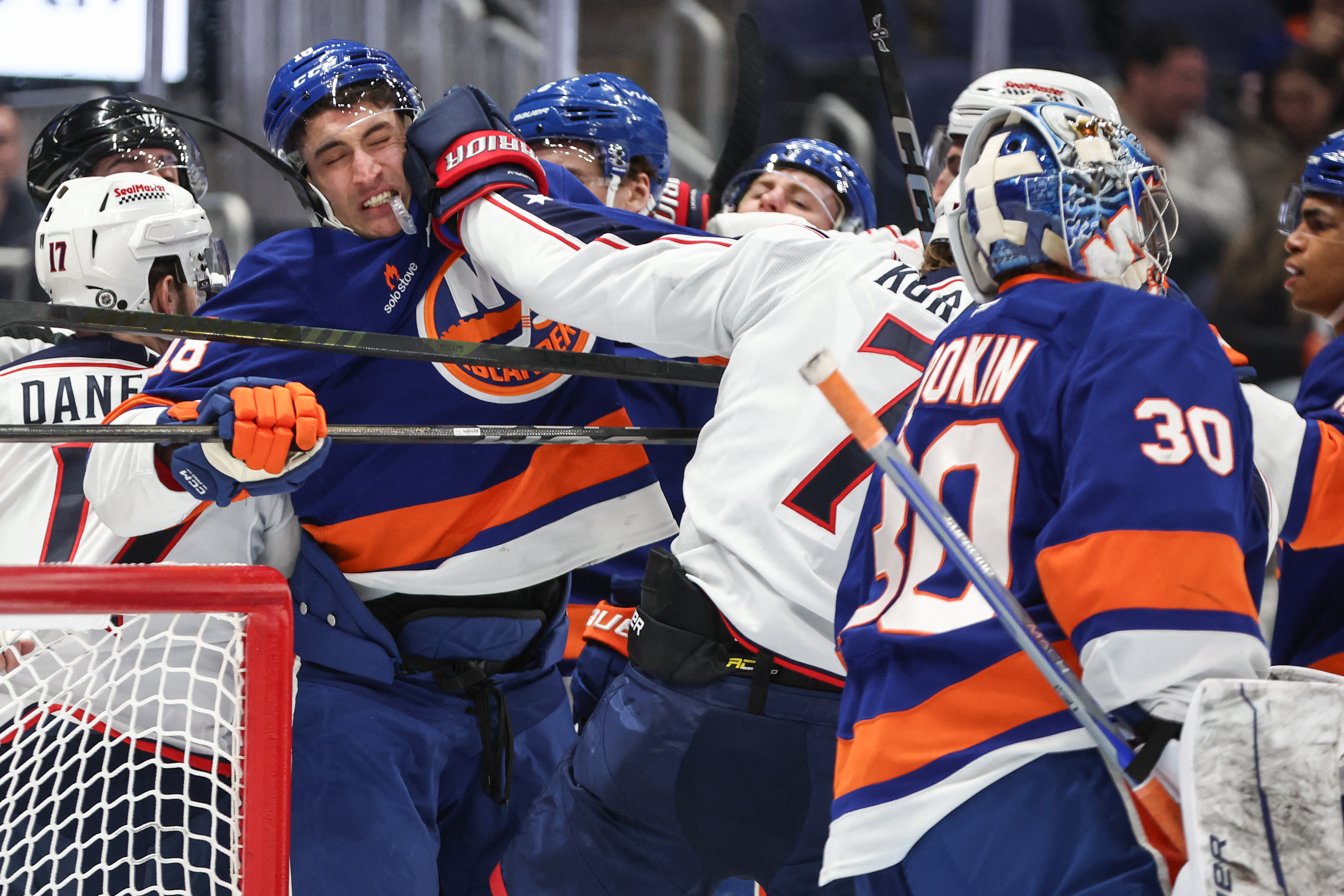 New York Islanders left wing Pierre Engvall and Columbus Blue Jackets Sean Kuraly (7) fight in the third period at UBS Arena on January 20, 2025 in Elmont, New York. (Photo by Wendell Cruz/USA TODAY Sports via Reuters)