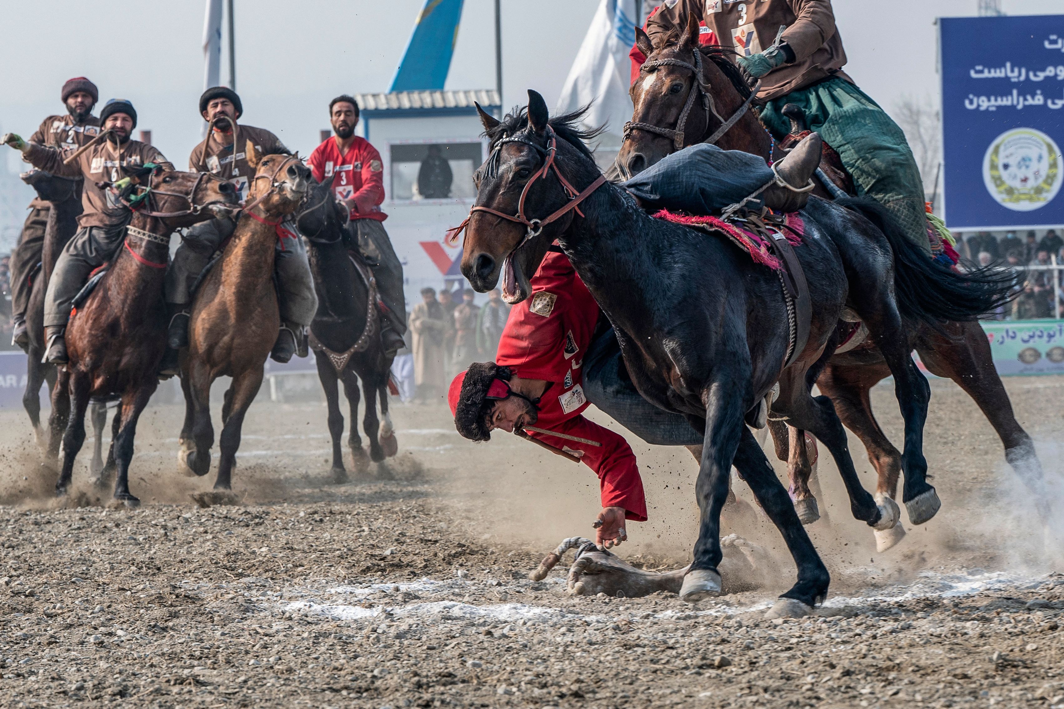 Afghan horsemen from the Badakhshan and Faryab teams compete during the sixth annual Buzkashi League of Afghanistan in Kabul on December 16, 2024. (Photo by Wakil Kohsar/AFP Photo)