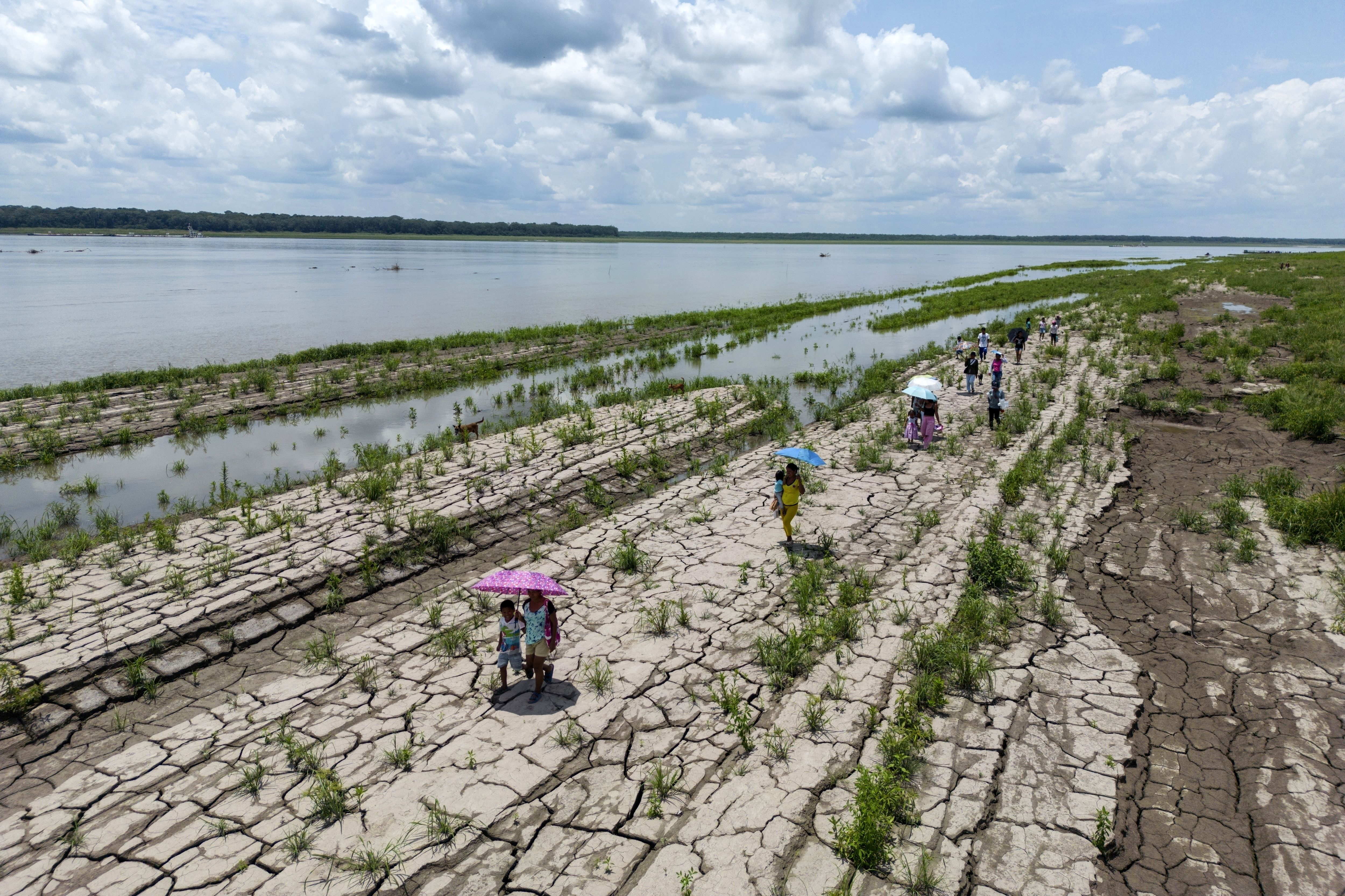 People walk through a part of the Amazon River that shows signs of drought in Santa Sofia, on the outskirts of Leticia, Colombia, October 20, 2024. (Photo by Ivan Valencia/AP Photo)