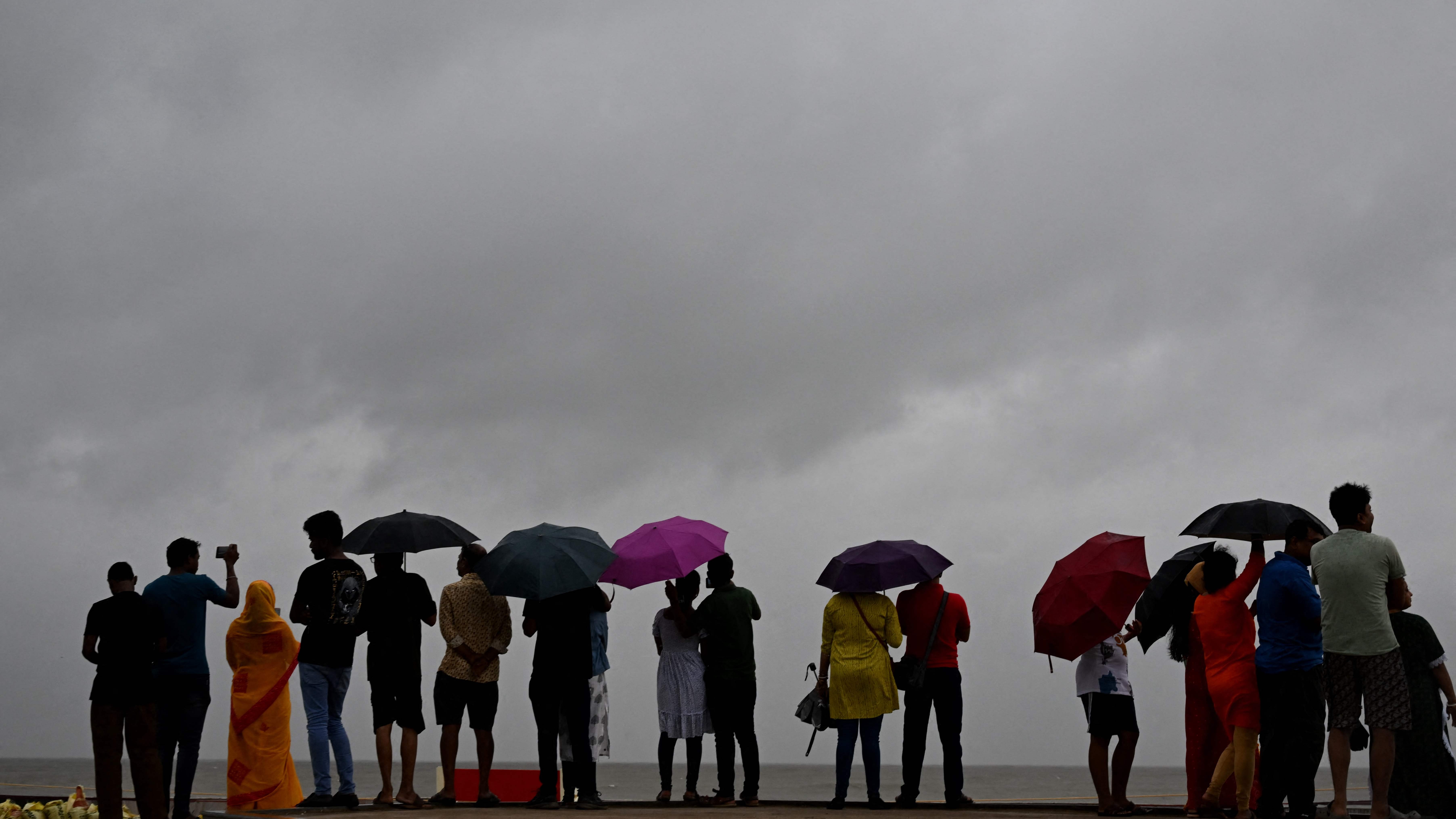 Dark clouds loom over the Bay of Bengal as local people and tourists stand along a beach in Digha, around 200km southwest of Kolkata, on October 24, 2024, as cyclone Dana is likely to hit the coasts of India's West Bengal and Odisha states. At least 1.1 million people on India's eastern coast are fleeing to storm shelters inland, hours before a powerful cyclone is expected to hammer the low-lying region, ministers said on October 24. (Photo by Dibyangshu Sarkar/AFP Photo)
