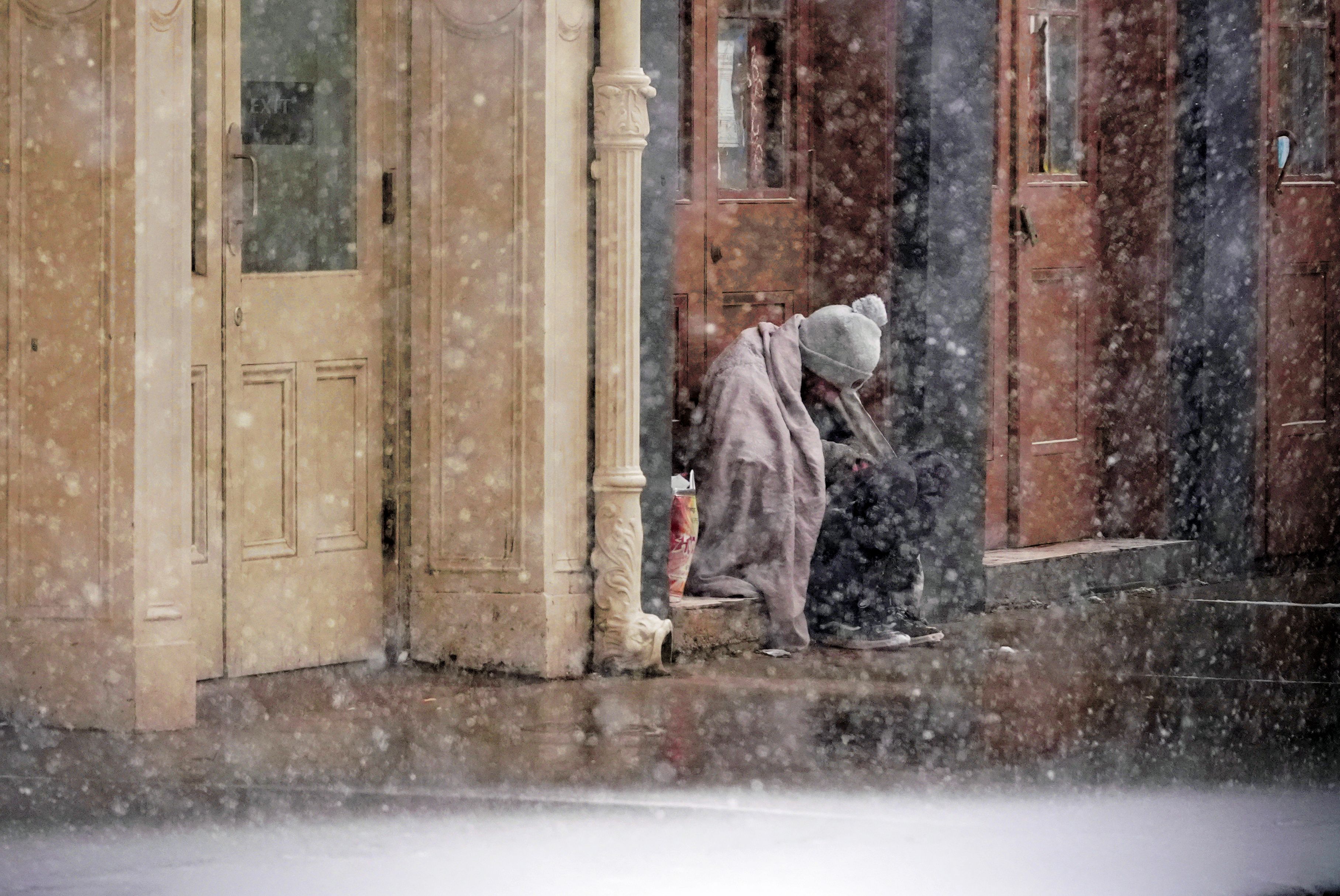A homeless man sits in a doorway as snow falls in the French Quarter in New Orleans, Tuesday, January 21, 2025. (Photo by Gerald Herbert/AP Photo)
