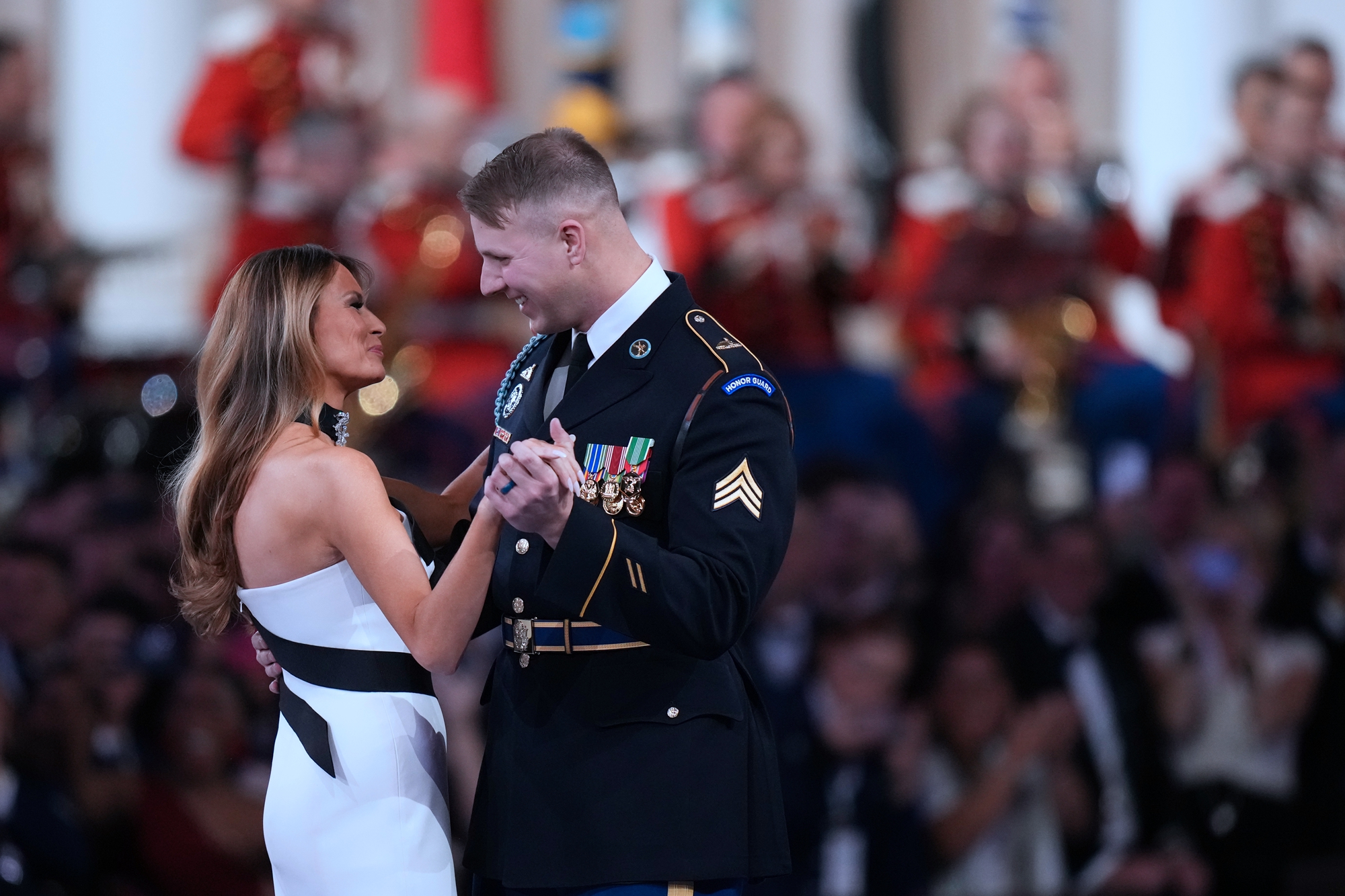 First Lady Melania Trump dances with a service members at the Commander-in-Chief Ball on January 20, 2025 in Washington, DC. President Trump attends some of the inaugural balls after taking the oath as the 47th president. (Photo by Andrew Harnik/Getty Images)