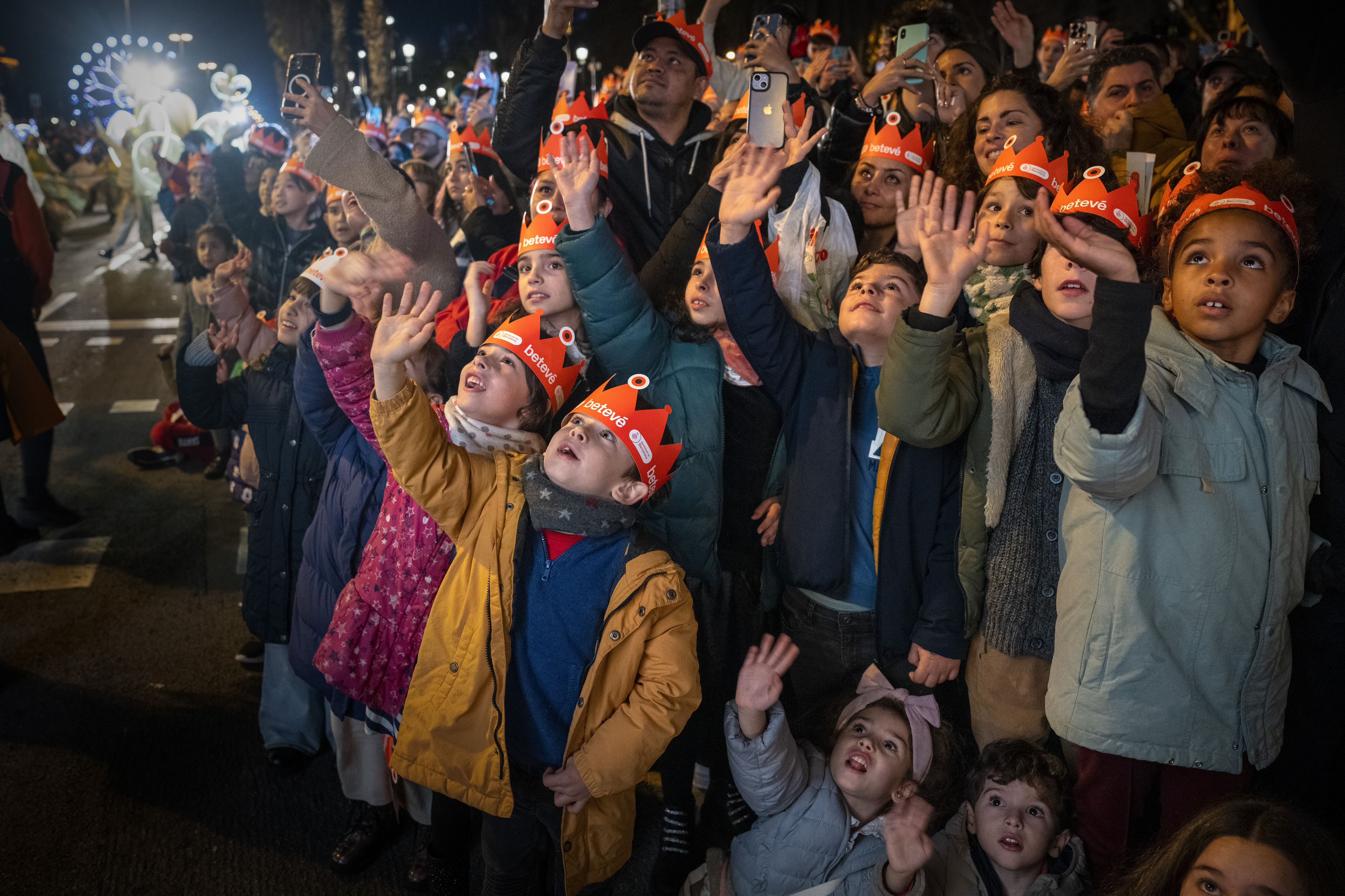 Children greet one of the three wise men as they attend the traditional “Cabalgata de Reyes” parade in Barcelona, Spain, Sunday, January 5, 2025, as part of the festivities marking the Catholic feast of Epiphany. (Photo by Emilio Morenatti/AP Photo)