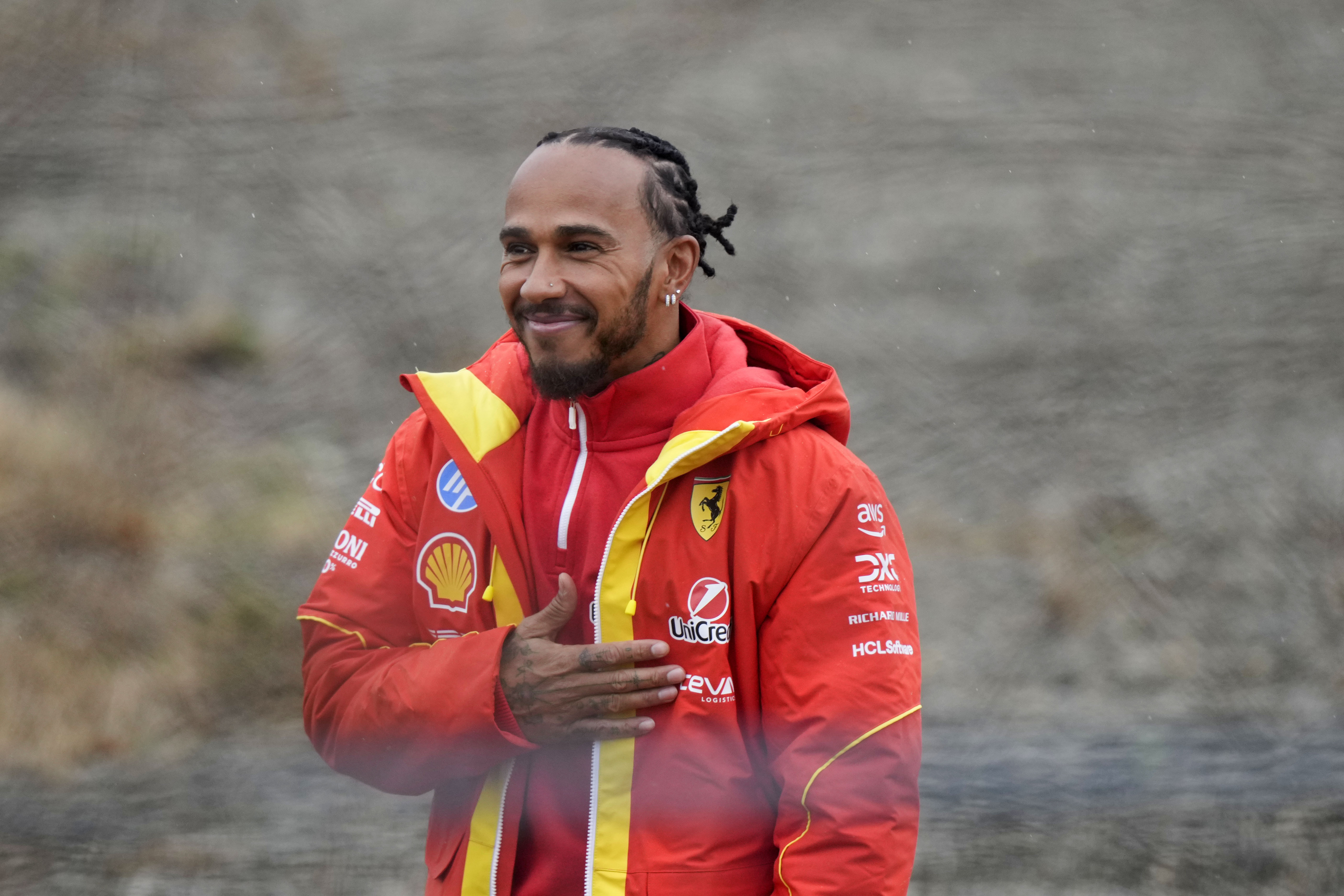 British driver Lewis Hamilton greets Ferrari fans gathered outside the track, after testing a Ferrari Formula One SF-23, in Fiorano Modenese, Italy, Wednesday, January 22, 2025. (Photo by Luca Bruno/AP Photo)