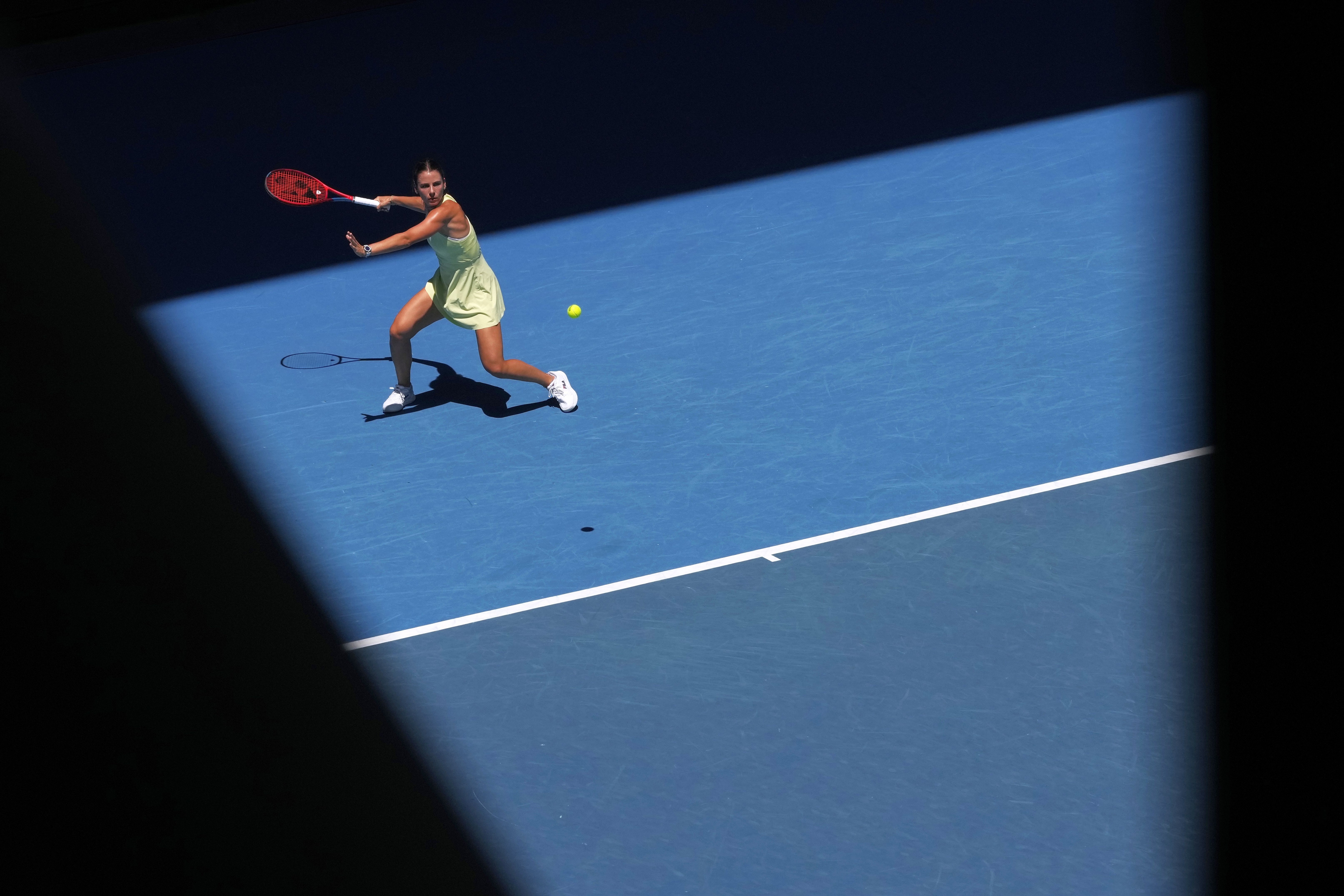 Emma Navarro of the U.S. plays a forehand return to Ons Jabeur of Tunisia during their third round match at the Australian Open tennis championship in Melbourne, Australia, Saturday, January 18, 2025. (Photo by Manish Swarup/AP Photo)