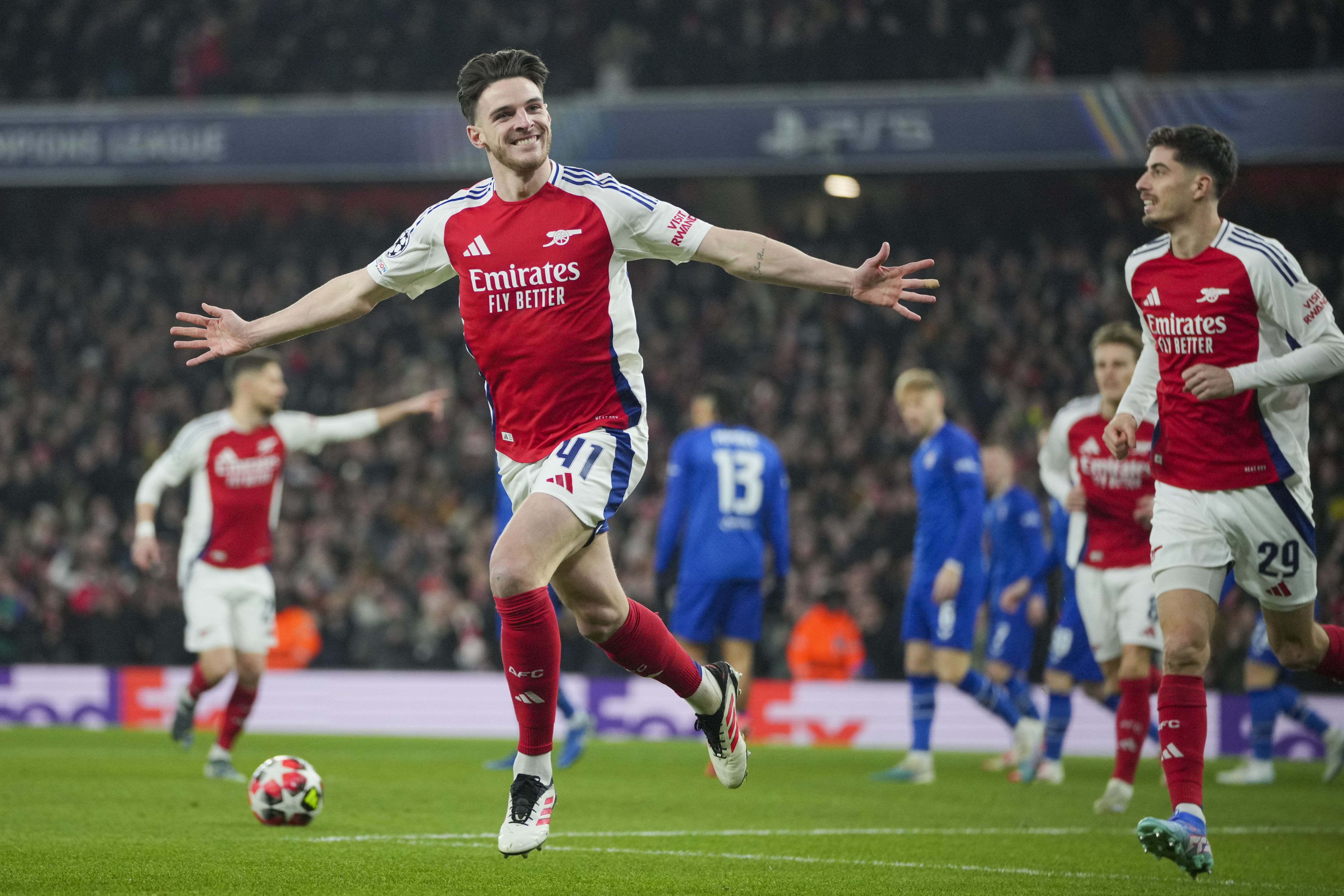 Arsenal's Declan Rice, centre, celebrates after scoring his side's opening goal during the Champions League soccer match between Arsenal and Dinamo Zagreb at the Emirates stadium in London, Wednesday, January 22, 2025. (Photo by Kin Cheung/AP Photo)
