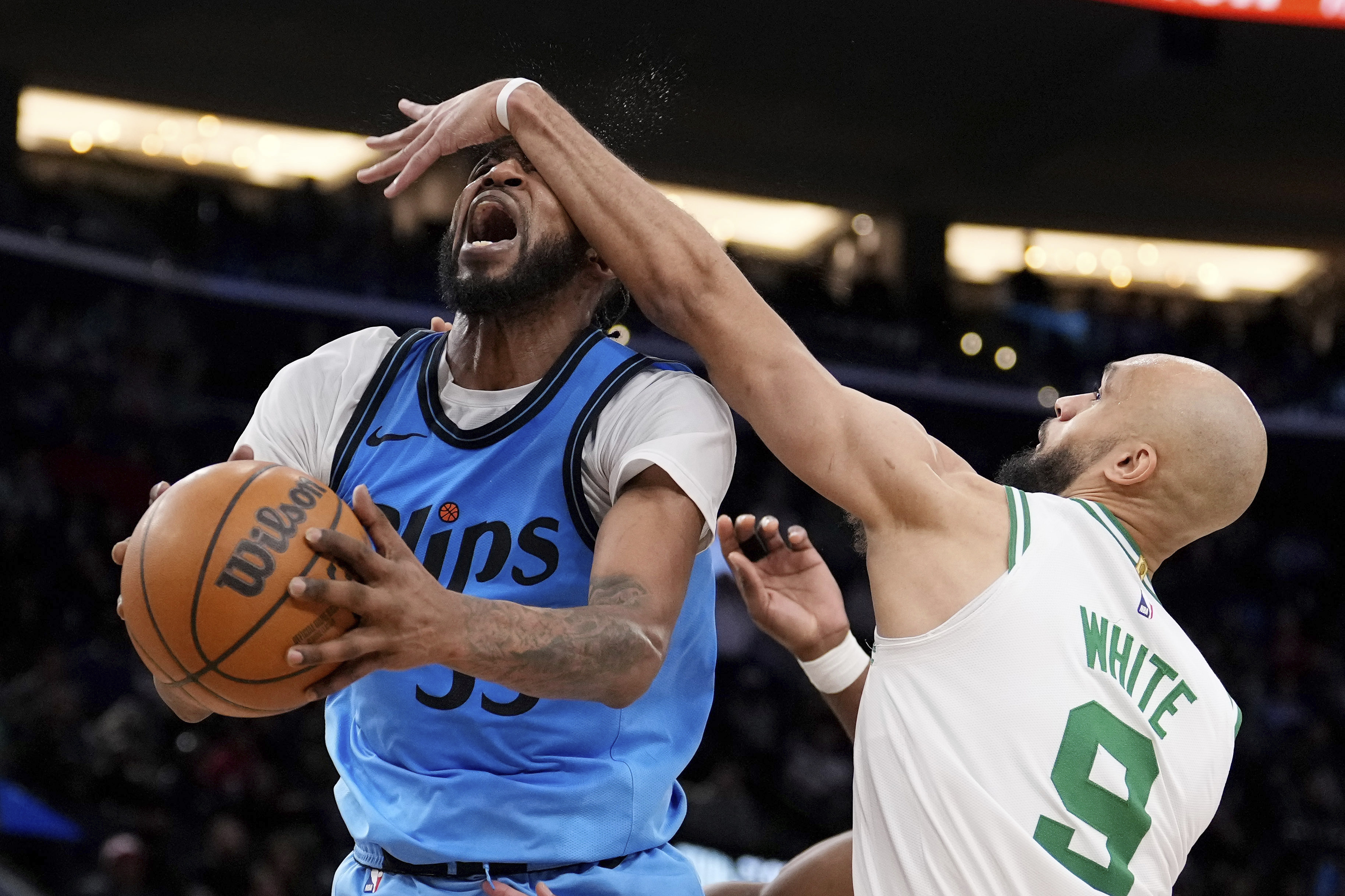 Los Angeles Clippers forward Derrick Jones Jr., left, is fouled while shooting by Boston Celtics guard Derrick White during the second half of an NBA basketball game, Wednesday, January 22, 2025, in Inglewood, Calif. (Photo by Mark J. Terrill/AP Photo)