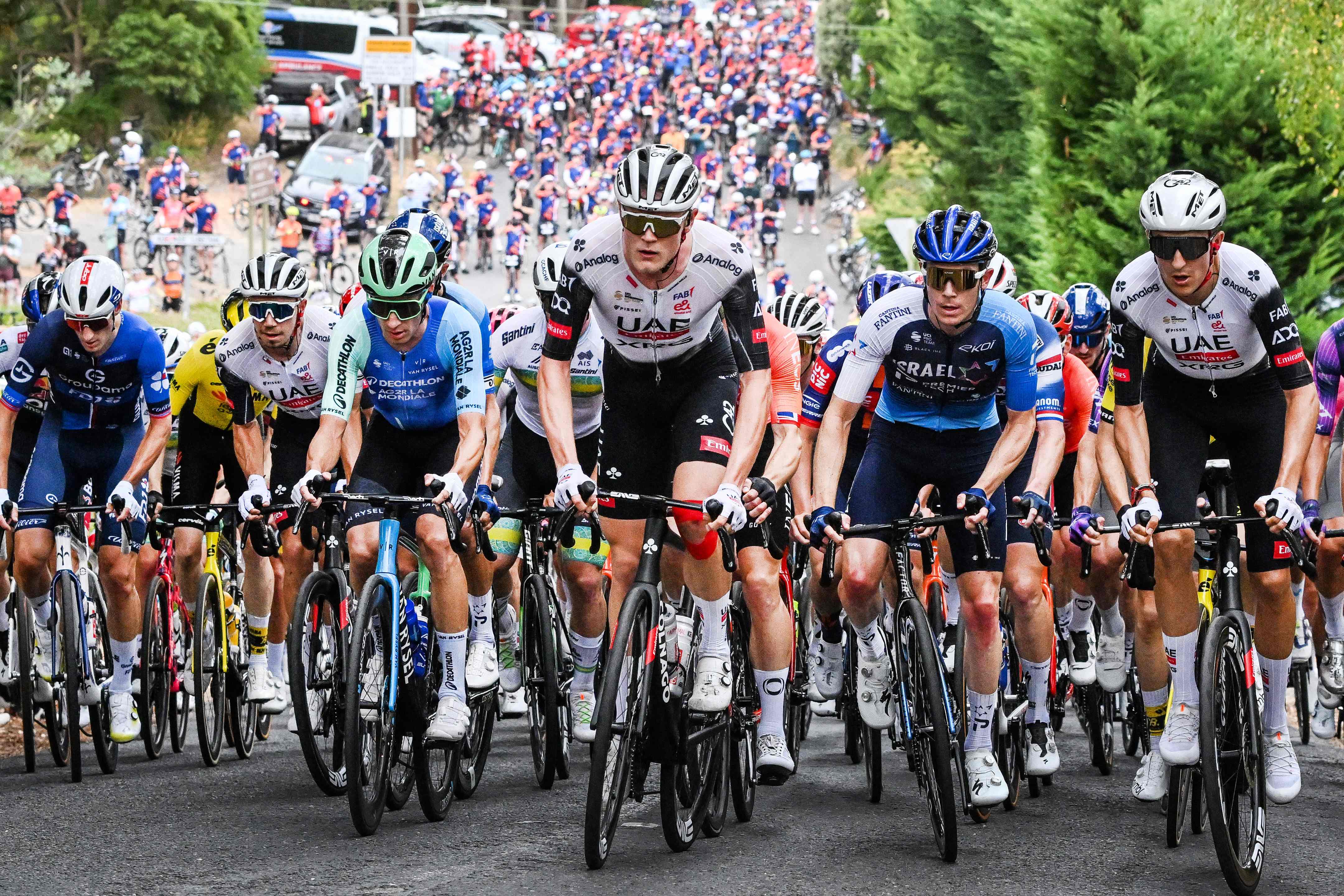 UAE Team Emirates rider Julius Johansen from Denmark (C) leads the peloton during the men's stage 3 of the Tour Down Under cycling race in Adelaide on January 23, 2025. (Photo by Brenton Edwards/AFP Photo)