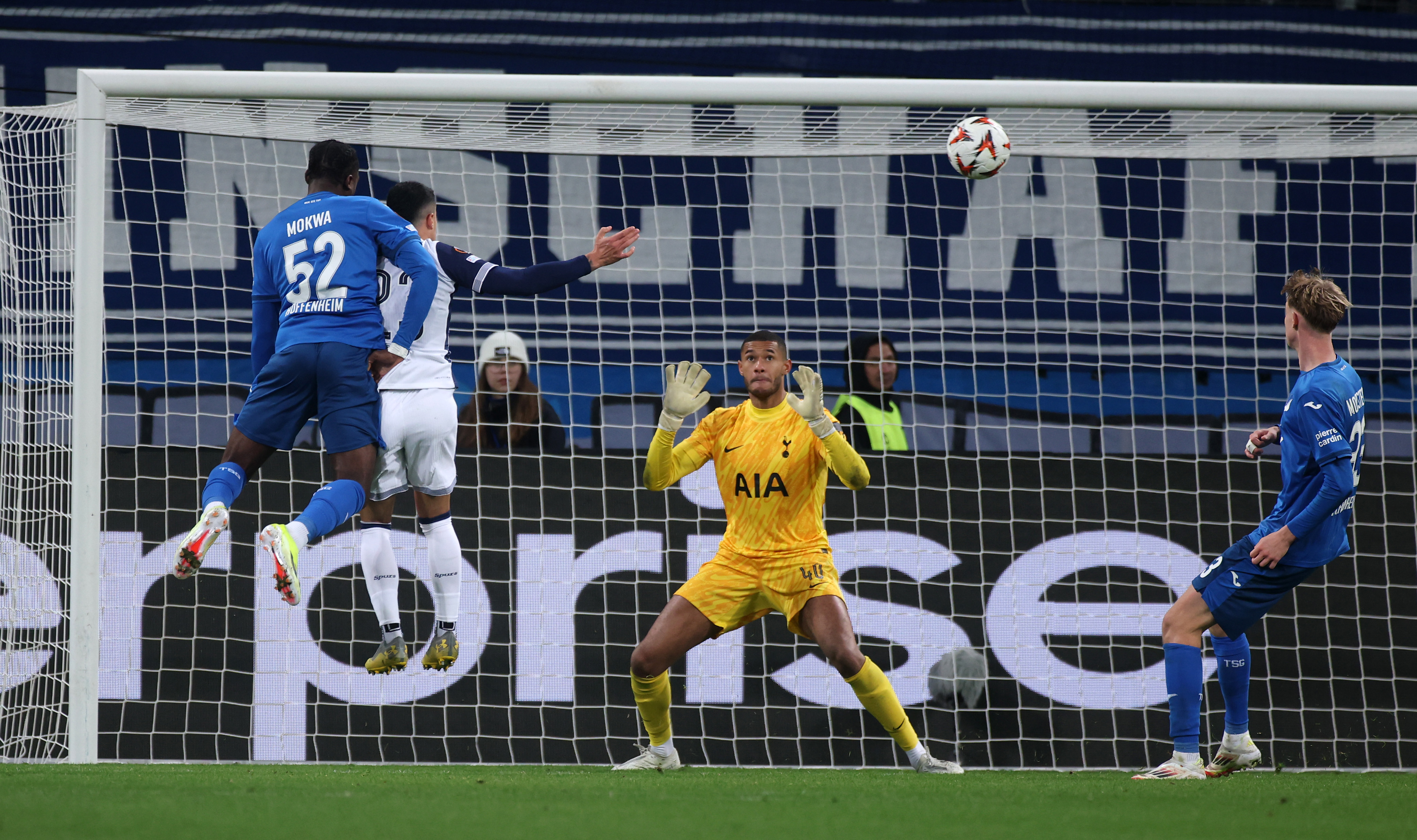 Brandon Austin of Tottenham Hotspur fails to stop David Mokwa of TSG 1899 Hoffenheim from scoring his team's second goal during the UEFA Europa League 2024/25 League Phase MD7 match between TSG 1899 Hoffenheim and Tottenham Hotspur at Rhein-Neckar-Arena on January 23, 2025 in Sinsheim, Germany. (Photo by Alex Grimm/Getty Images)