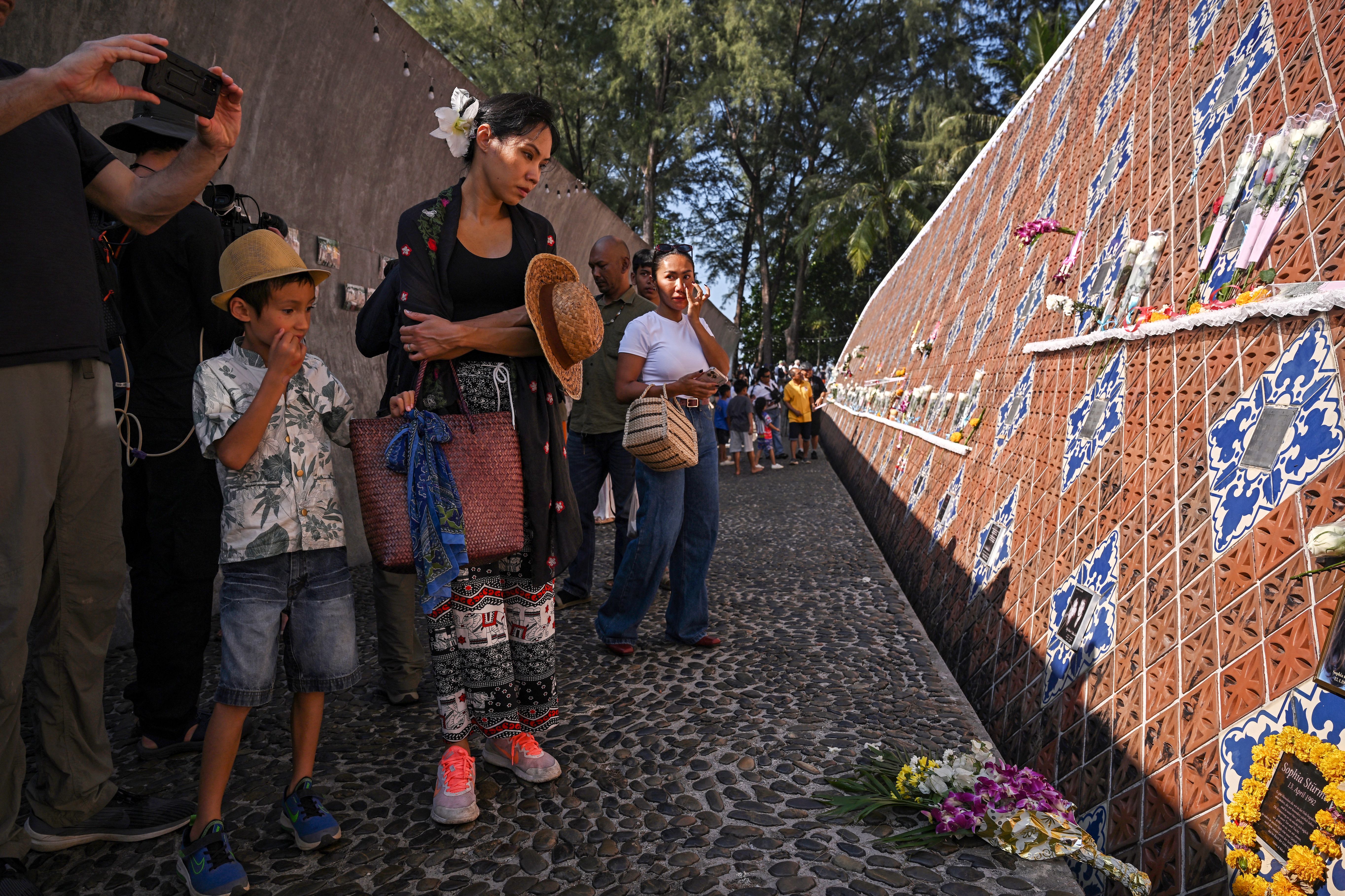 People look at portraits of tsunami victims at the Ban Nam Khem Tsunami Memorial wall in the southern Thai province of Phang Nga on December 26, 2024. Emotional ceremonies began across Asia on December 26 to remember the 220,000 people who died two decades ago when a tsunami devastated coastal areas around the Indian Ocean, in one of the worst natural disasters in human history. (Photo by Lillian Suwanrumpha/AFP Photo)